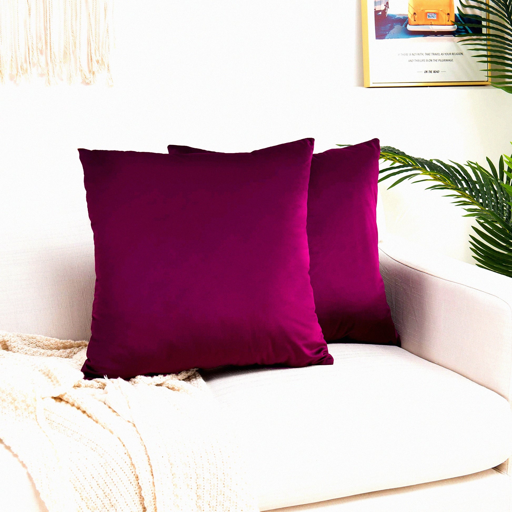 Velvet Soft Decorative Pillow Covers Set - 2 Pack Square Cushion Cases for Sofa Bedroom Car - 20x20 Eggplant Purple - Plush Home Decor Accents