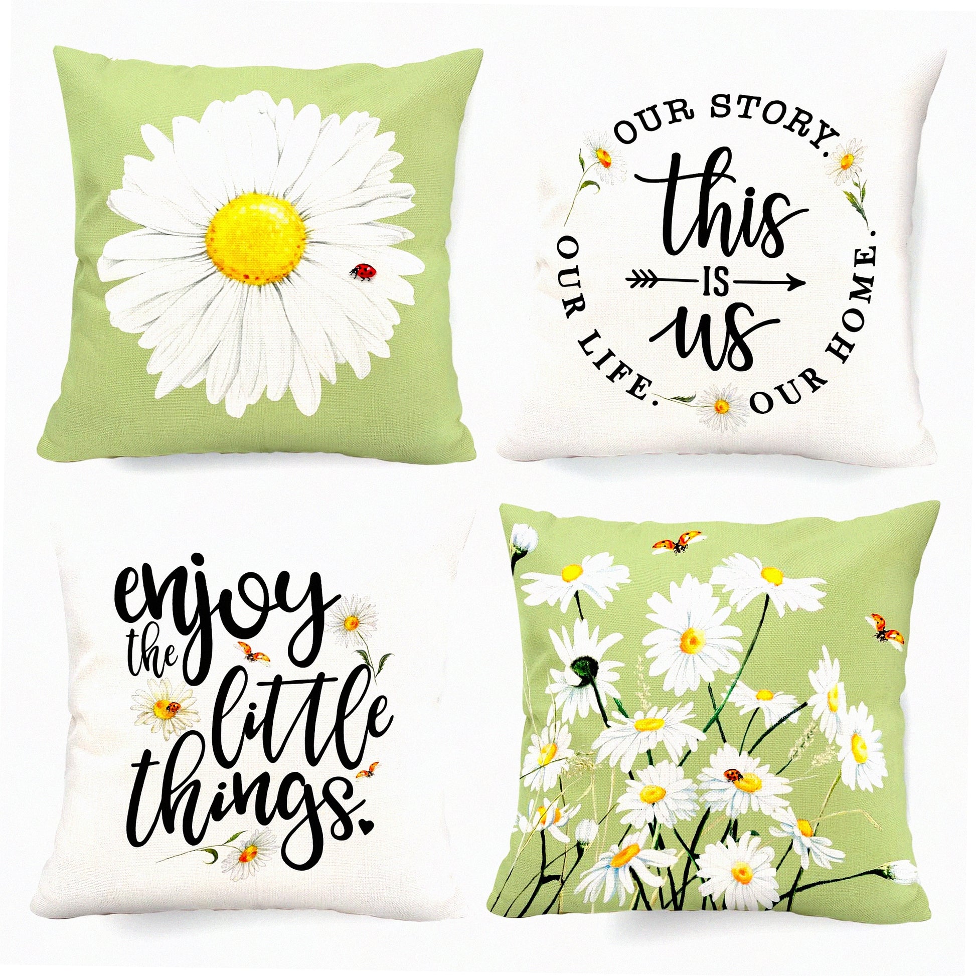 Daisy Bloom Pillow Covers Set of 4 - 18x18 Inch Farmhouse Decorative Throw Pillows for Couch Sofa Indoor Outdoor, Spring Summer Light Green Floral