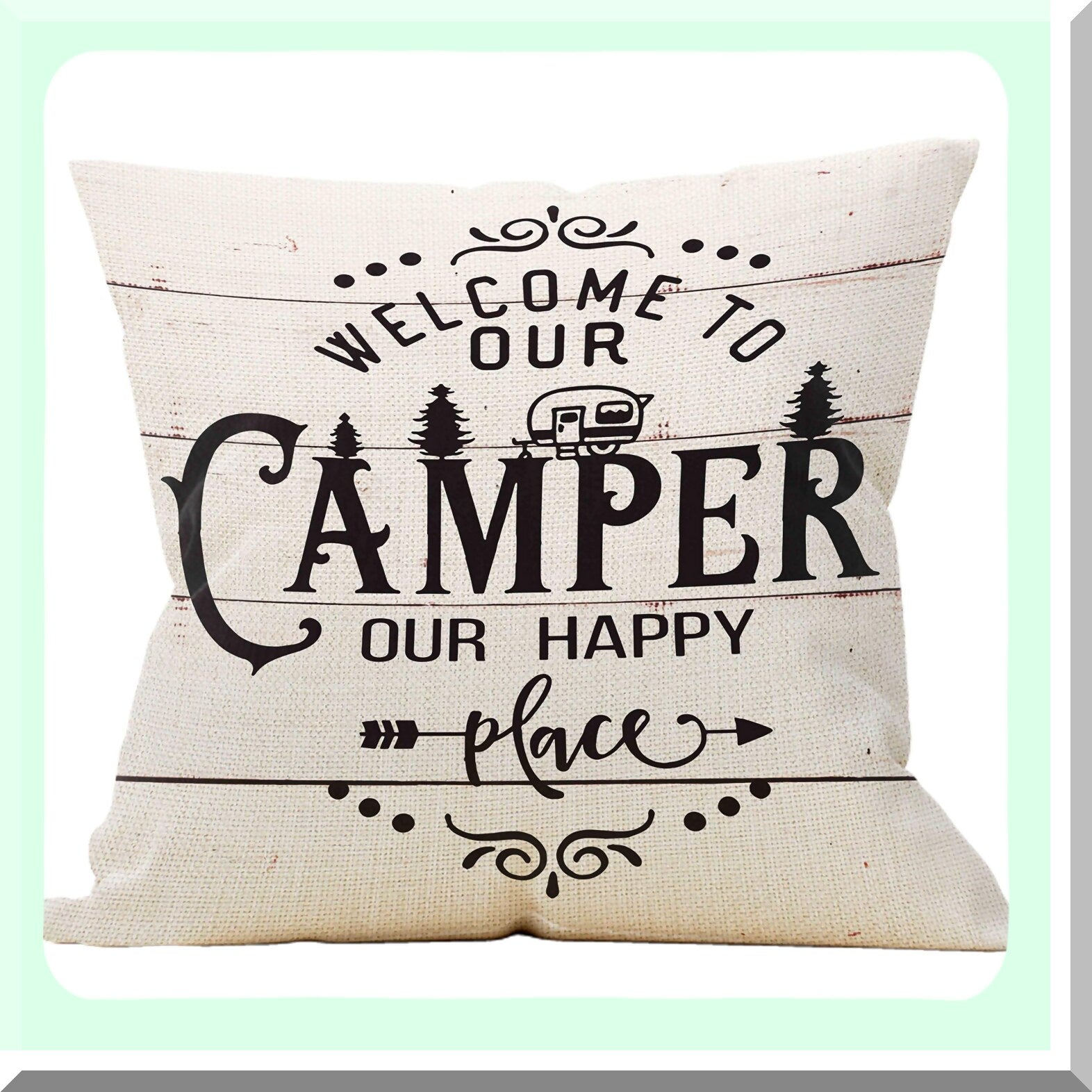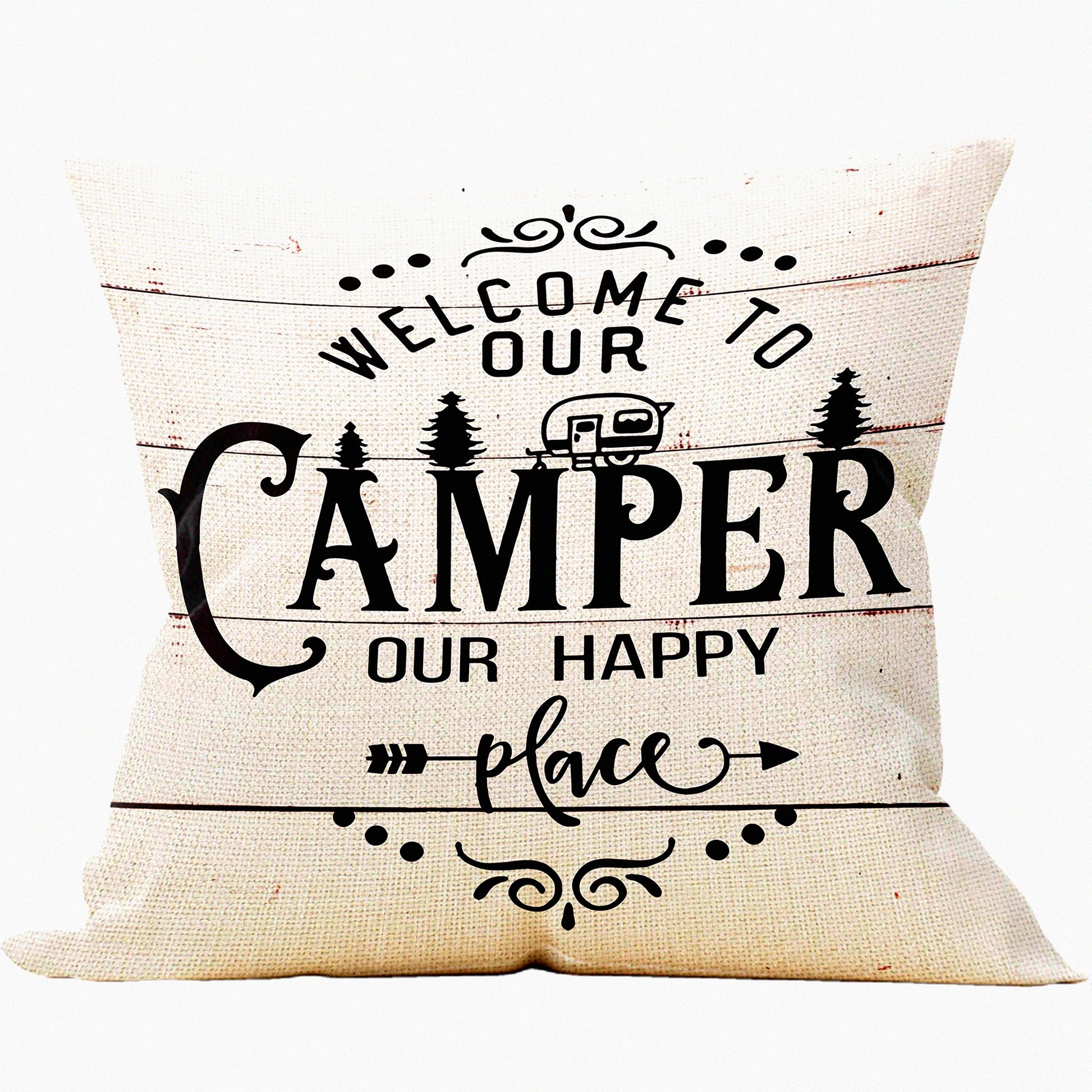 Happy Camper Pillow Cover - RV Decorations & Gifts | 18x18 Camper Decor | Best Gifts for Campers | Camper Decorations for RV Owners