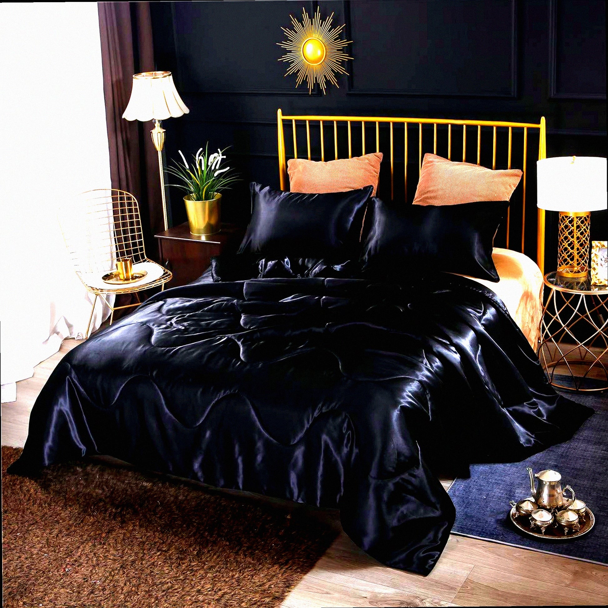 Luxury Black Silky Comforter Set - Soft Lightweight Microfiber Quilted Bedding with Matching Pillow Covers - Queen Size for Summer, Spring, Autumn