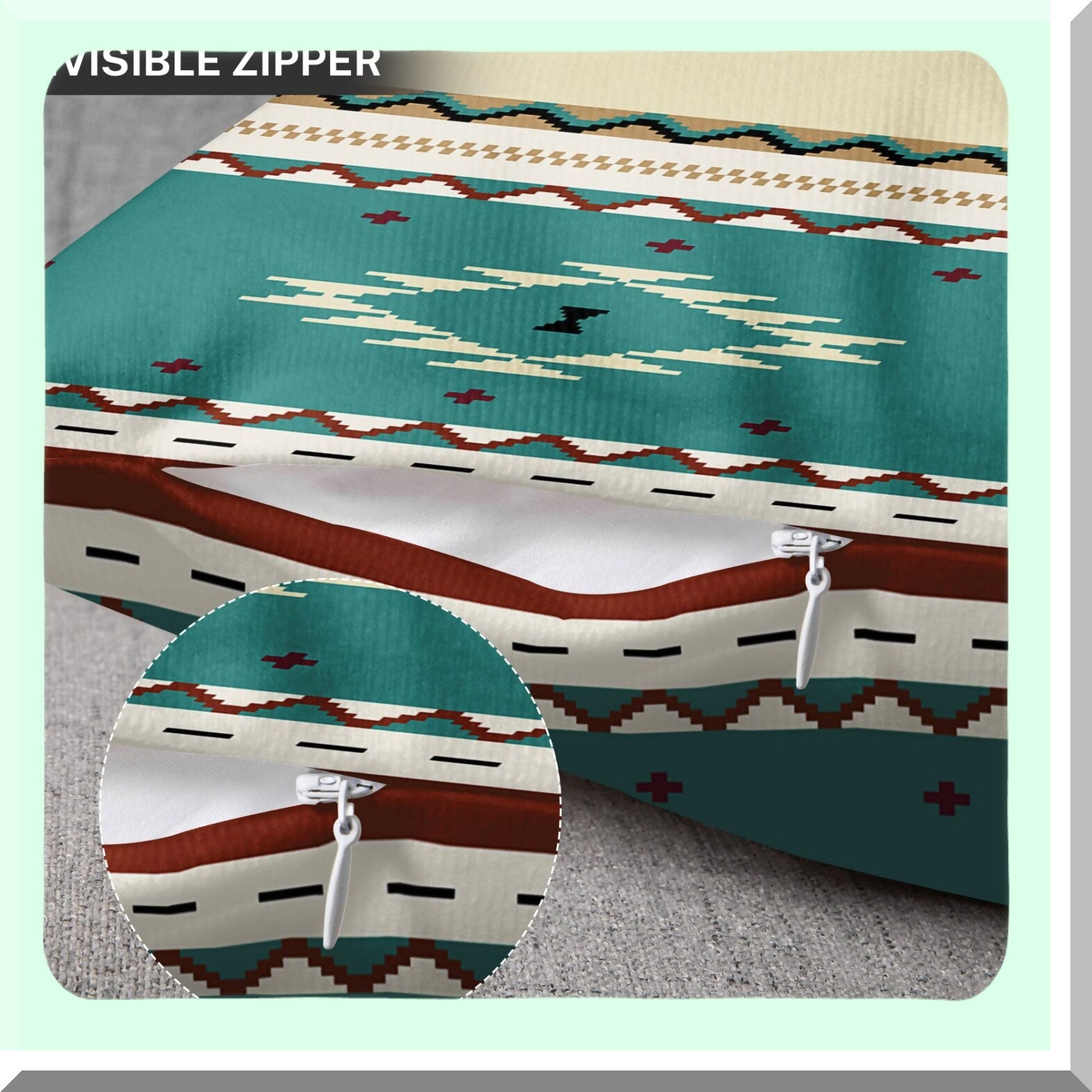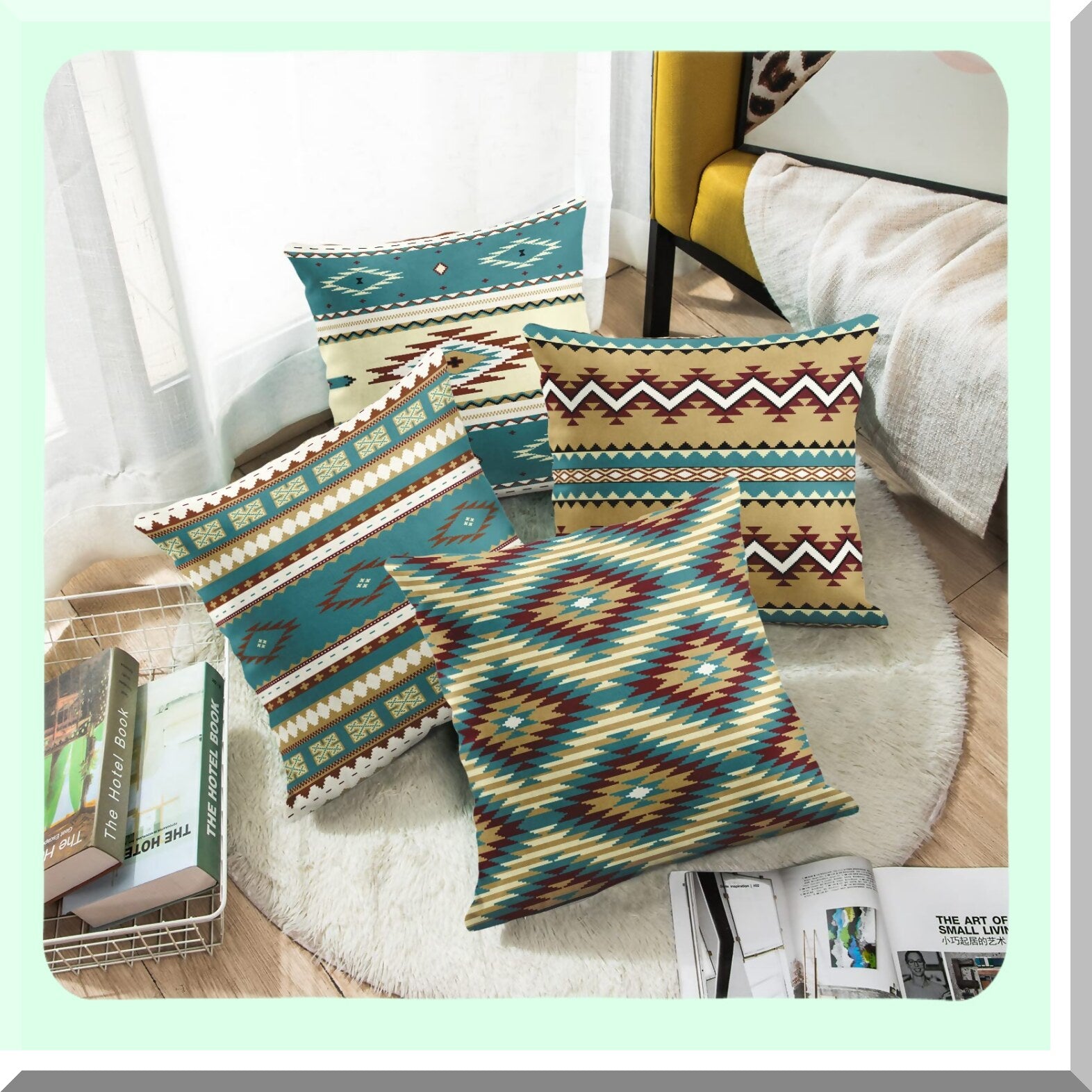 South Western Turquoise Tribal Pillow Covers - Set of 4 | Ethnic Seamless Pattern Decorative Cases for Home Decor | Standard Square 16x16 Inches Pillowcases
