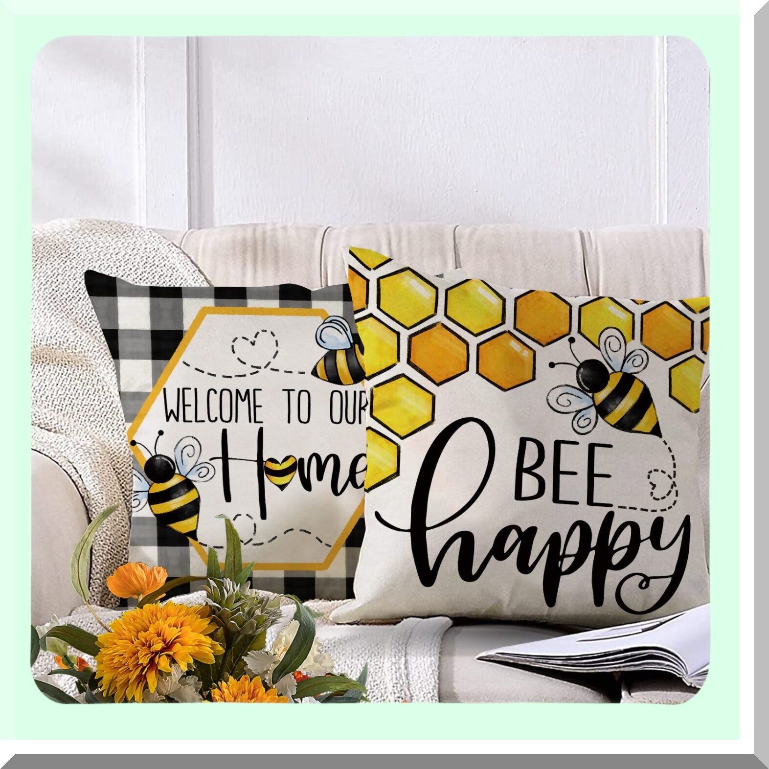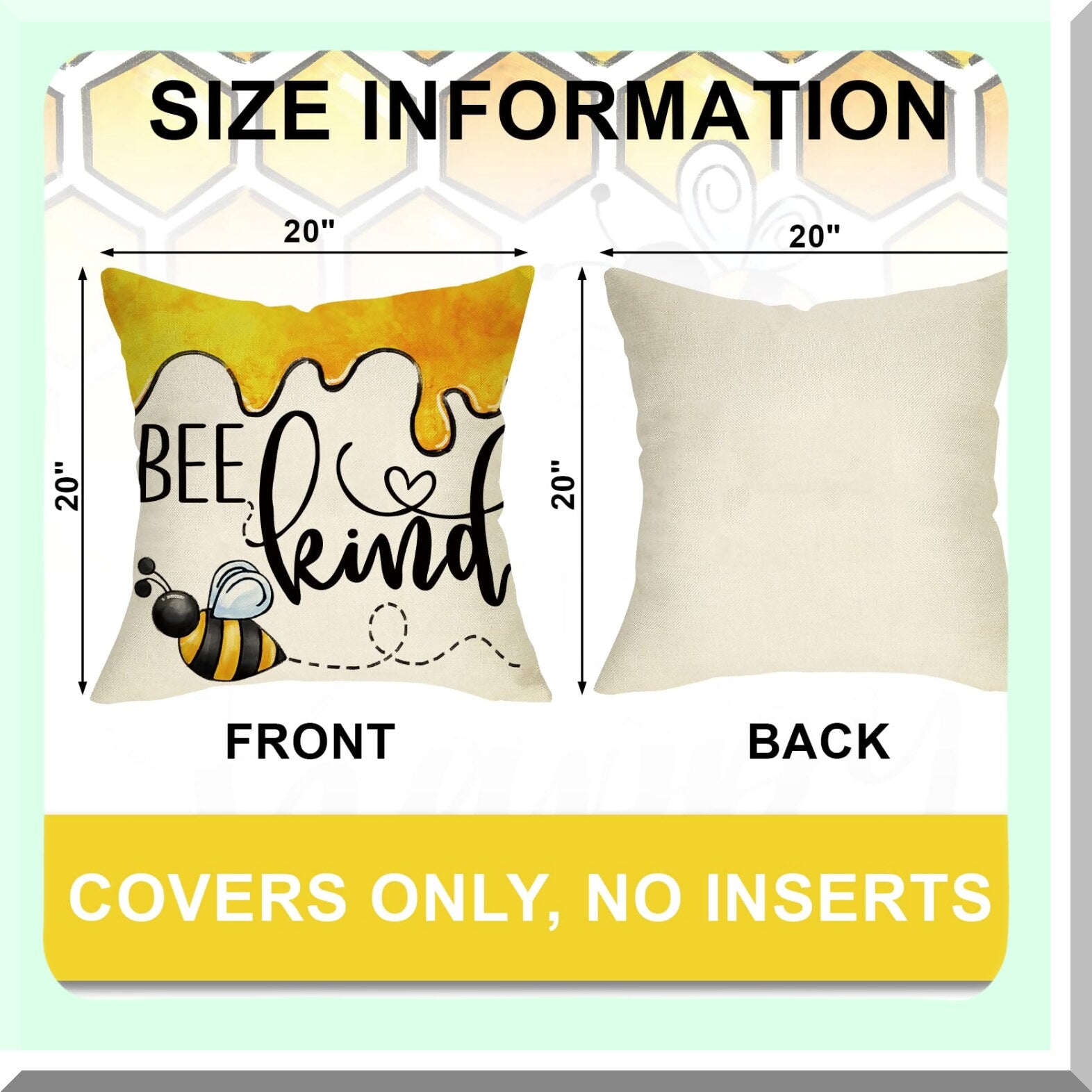 Happy Hive Farmhouse Pillow Covers - Set of 4, Bee Kind Decorative Cushion Cases 20 x 20, Black White Buffalo Plaid Honey Theme, Summer Spring Home Decor for Sofa Couch