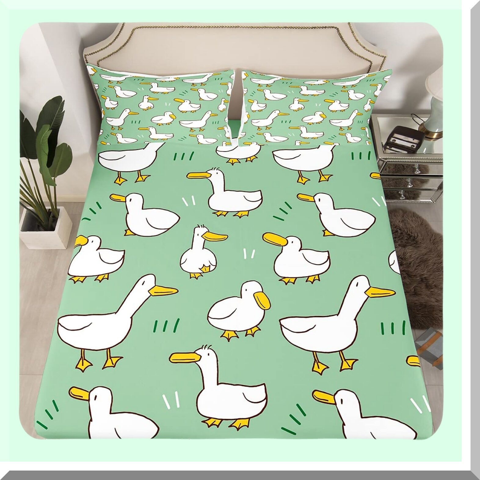 Farmhouse Duck Fitted Sheet Set - Soft Luxury Bedding with Cute Livestock Animal Design - Green Themed Bed Cover with Elastic Pocket & Pillowcases