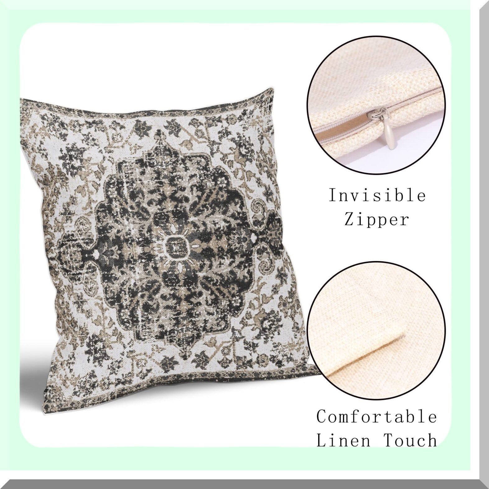 Boho Chic Floral Rug Pillow Covers - Set of 2 Vintage Ethnic Throw Pillow Cases for Farmhouse Home Decor - Black White Grey 20X20 Inches