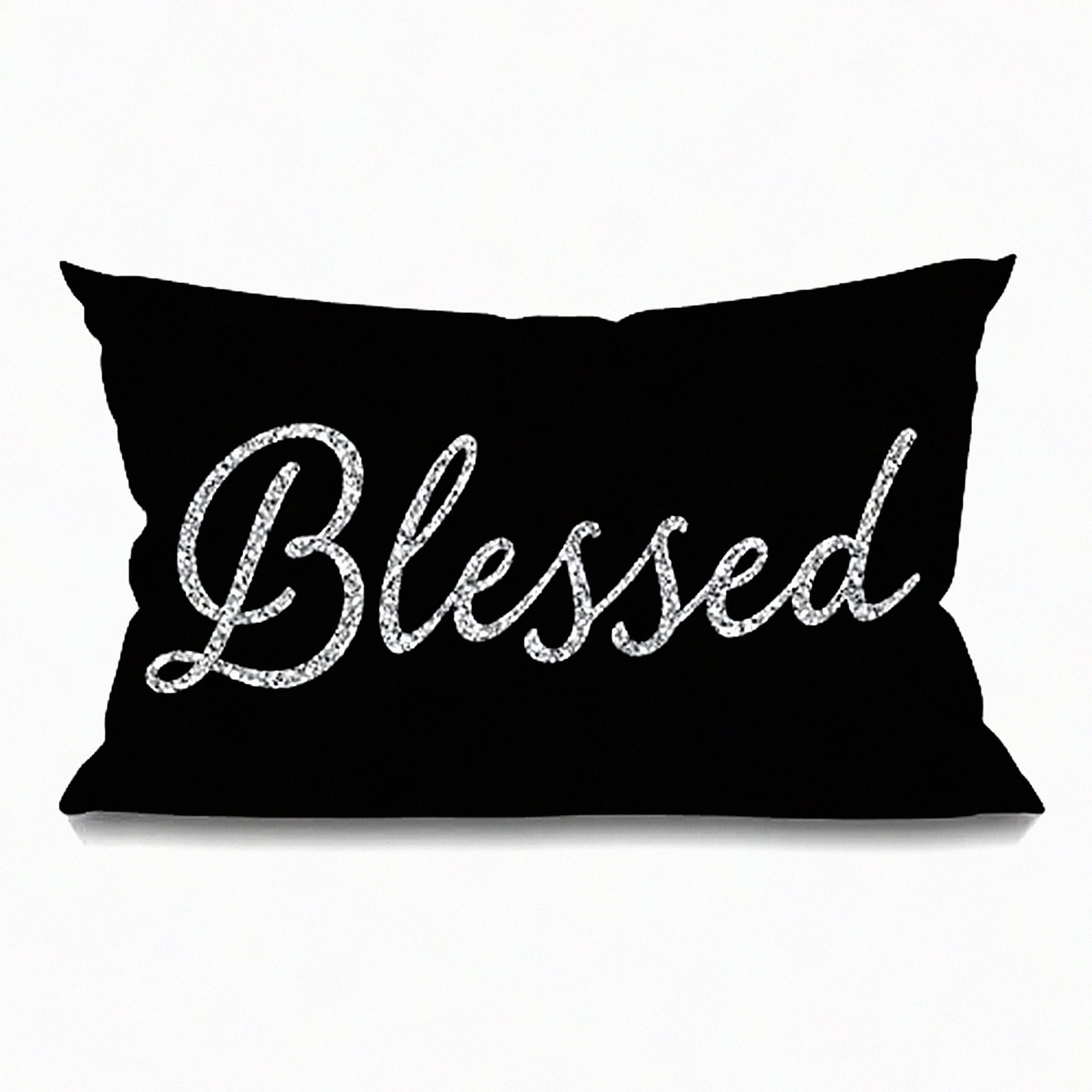 Blessed Words Inspirational Lumbar Pillow Cover - Black Cotton Linen Throw Cushion for Sofa Home Decor - 12"x20" Oblong Case