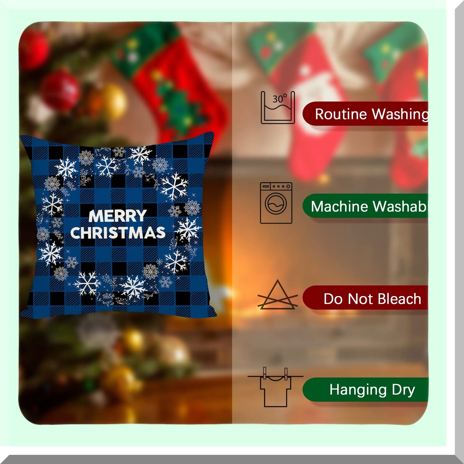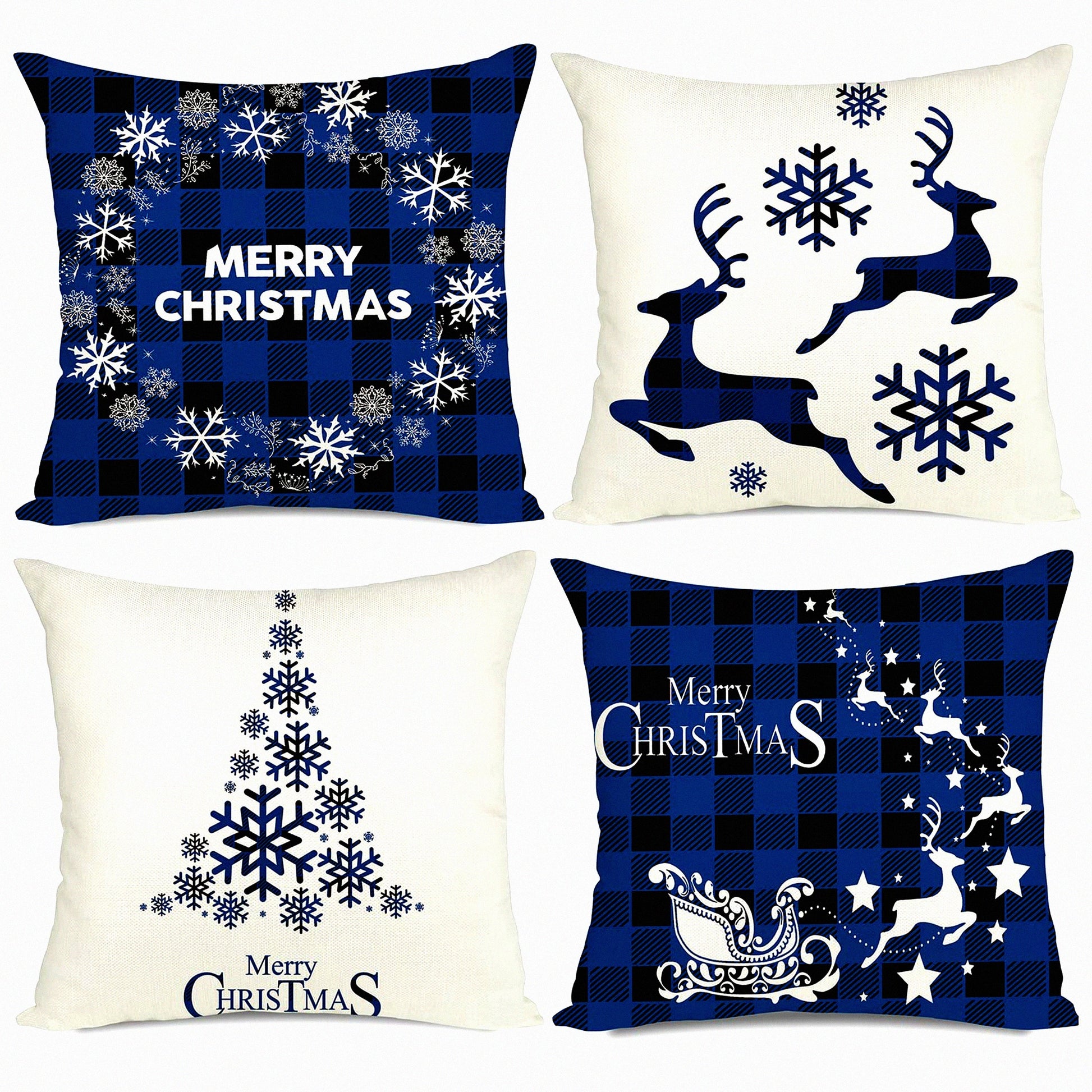 Buffalo Plaid Xmas Tree Pillow Covers - Set of 4 - Farmhouse Decorative Cushion Cases for Couch Sofa - Blue Outdoor Merry Theme - 16x16 Size