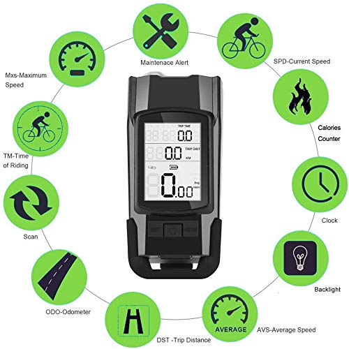 4-in-1 Bike Lights Set, Bike Computer with Light,Horn and Tail Light,Rechargeable IPX6 Waterproof Bike Speedometer Odometer,Bike Lights Front and Back,Cycling Computer for All Bikes (Black)