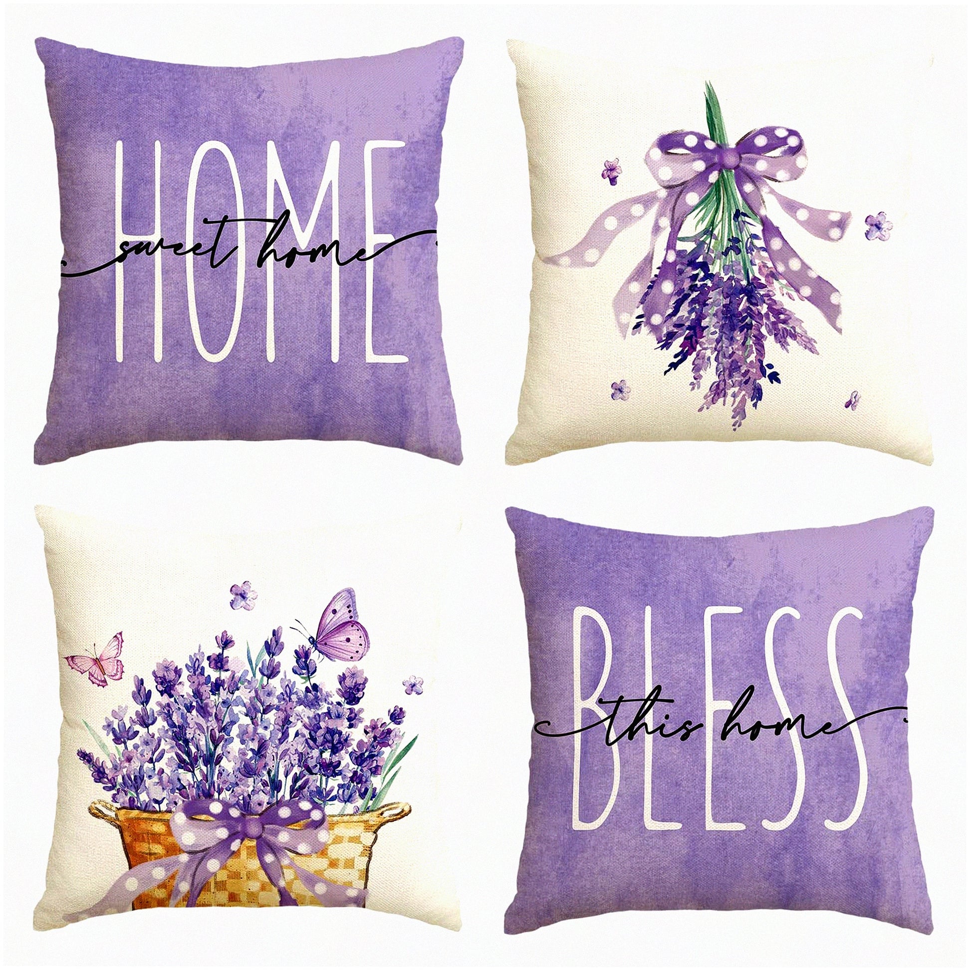 Purple Lavender Blessing Spring Home Decor Pillow Covers - Set of 4, 18x18 Inch Sofa Cushion Cases for Couch - Sweet Home Throw Pillows