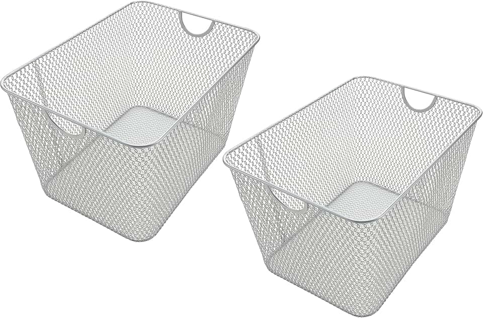 This set of two kitchen pantry organizers features durable wire baskets designed for versatile storage. Each basket measures 14 x 10 x 9 inches, providing ample space for organizing food supplies, snacks, and kitchen essentials. The open mesh design allows for easy visibility and access to stored items, helping to keep your pantry, cabinets, shelves, and countertops tidy. Made from sturdy metal with a sleek silver finish, these baskets are built to withstand daily use and support a variety of storage needs. Their lightweight construction makes them easy to move and reposition as needed. Ideal for maximizing space and maintaining an organized kitchen environment, these baskets are suitable for storing canned goods, dry foods, or small kitchen tools. The set of two offers a practical solution for creating a neat and accessible storage area, enhancing the overall functionality of your kitchen space.