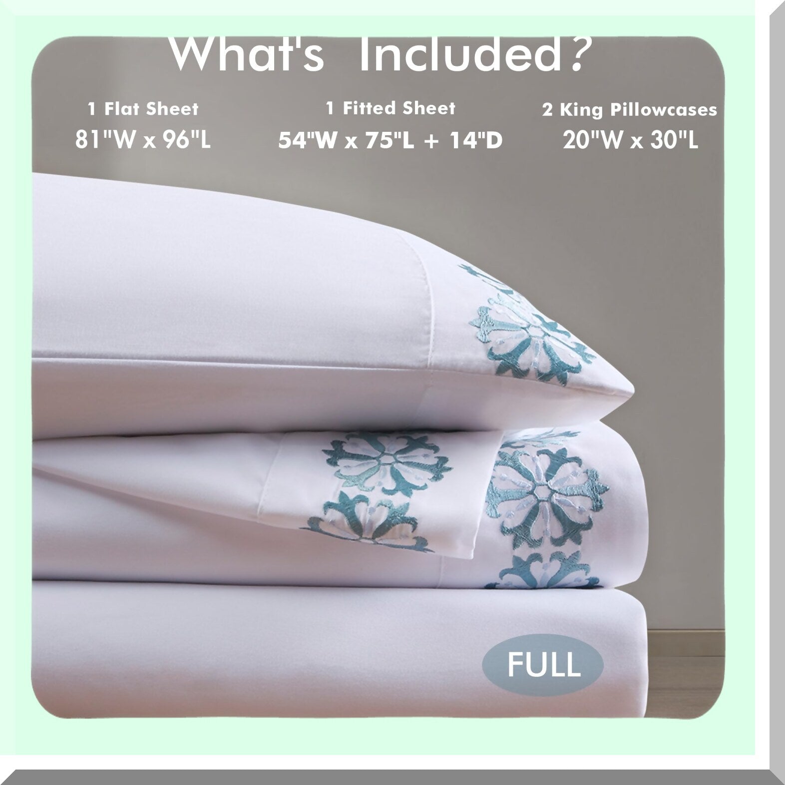 Luxury Medallion Embroidered Microfiber Sheet Set - Full Size Teal Bedding with Elastic Pocket - Soft Brushed Fabric, All Season Pillowcases - 4 Piece Elegant Design