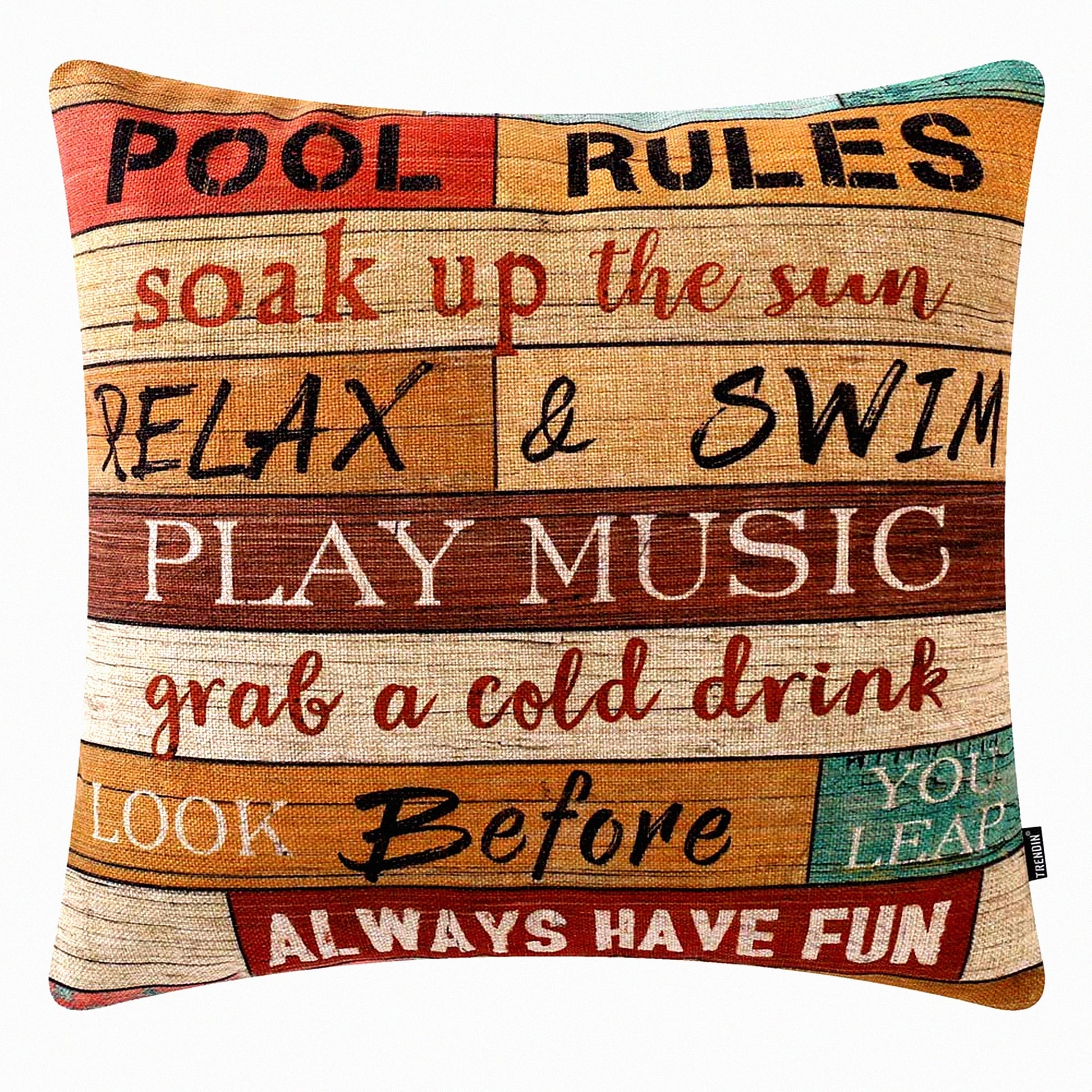 Poolside Plank Pillow Cover - 18x18 Inch Cotton Linen Cushion Case for Sofa Couch - Pool Rules Decorative Throw Pillow - PL506TR