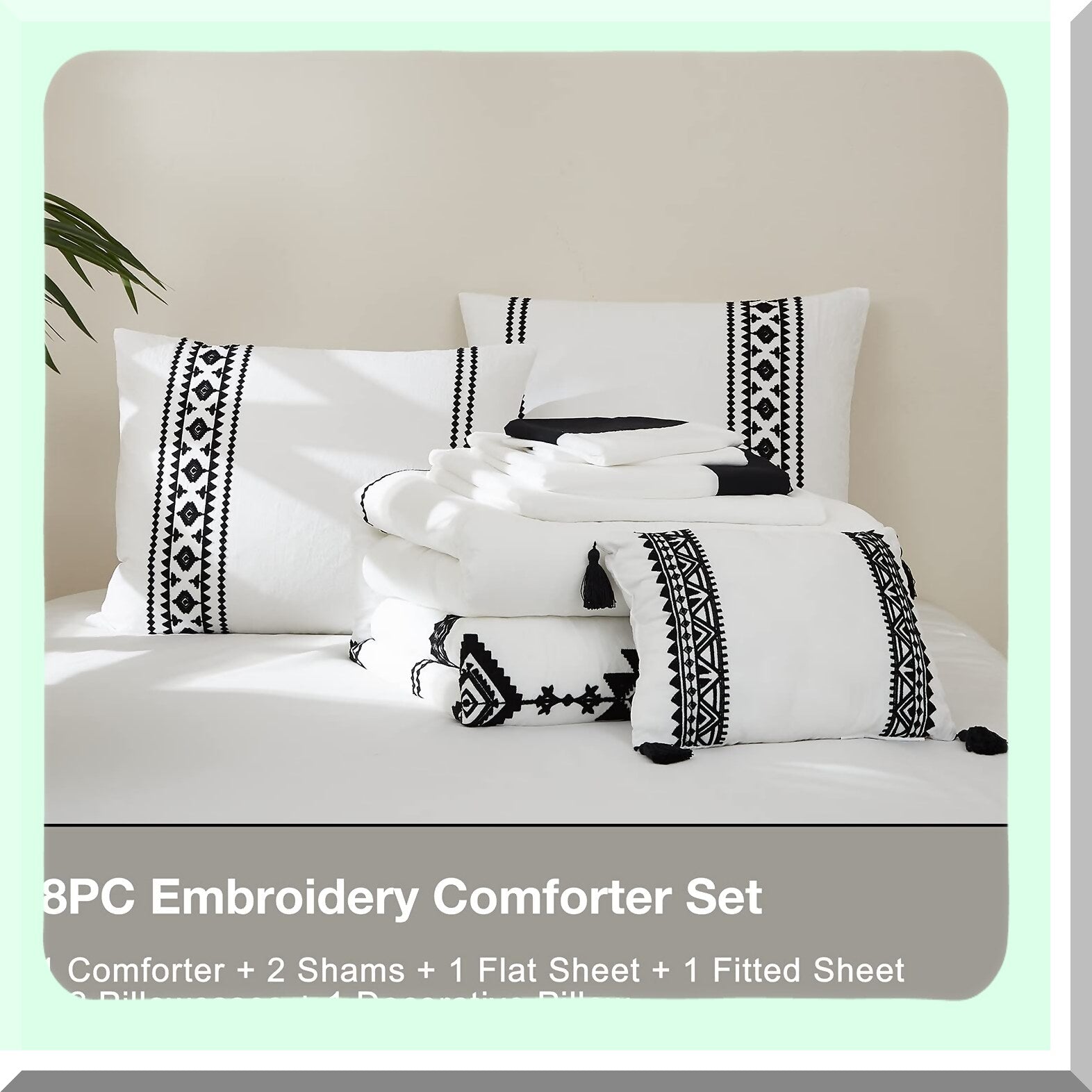Boho Farmhouse Queen Comforter Set - 8 Piece Embroidered Bedding Bundle with Sheets, Comforter, and Decorative Pillow - White Queen Size 90"X90"