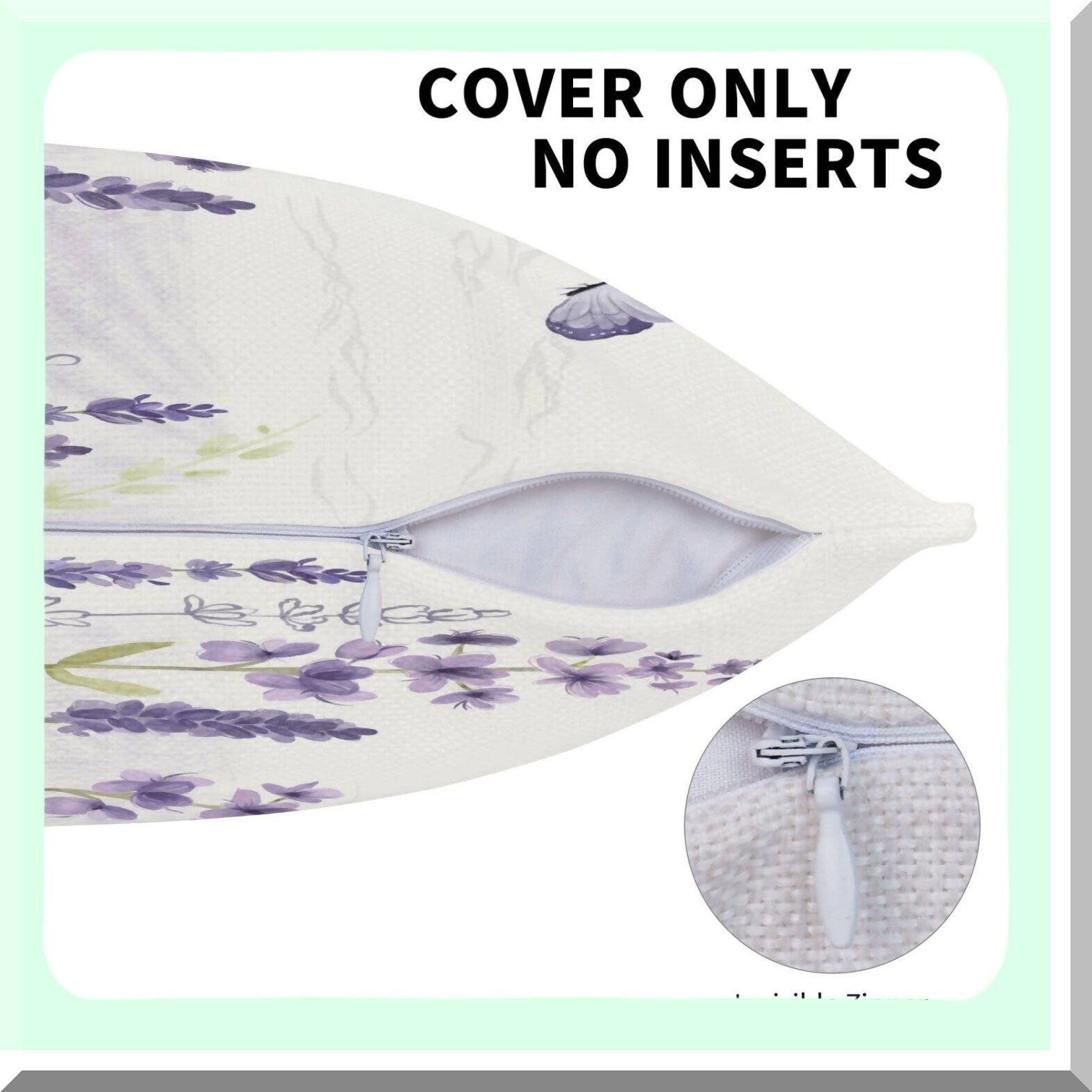 The practical benefits of this lavender throw pillow include its size, which fits most 16 X 16 inch pillows, and its invisible zipper. The size ensures compatibility with standard pillows, making it versatile for use in various settings. The invisible zipper provides a seamless and polished look while also allowing for easy removal and cleaning. These features enhance the user experience by offering convenience and functionality in both maintenance and aesthetic appeal.