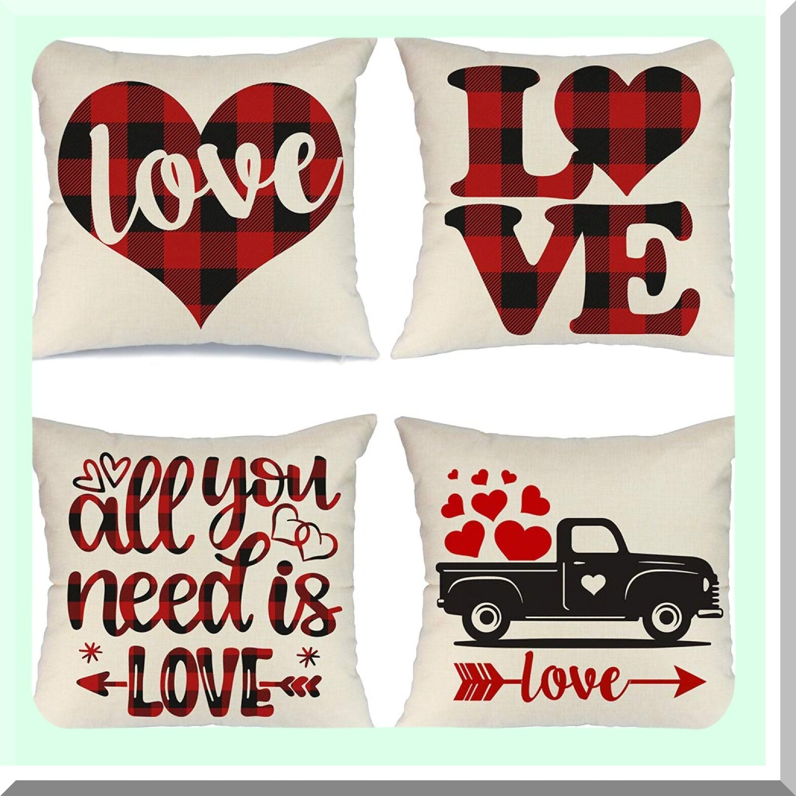 Love Plaid Heart Pillow Set - 20x20 Decorative Throw Pillows for Farmhouse Valentine's Day Decor - Set of 4 Home Decorations