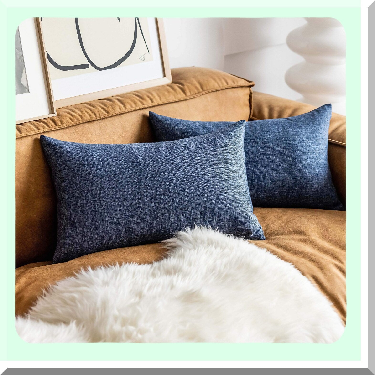 Navy Blue Linen Lumbar Pillow Covers - Set of 2 Decorative Throw Pillows for Couch Bed Chair - Solid Rectangle Cushion Covers 12x20 inch