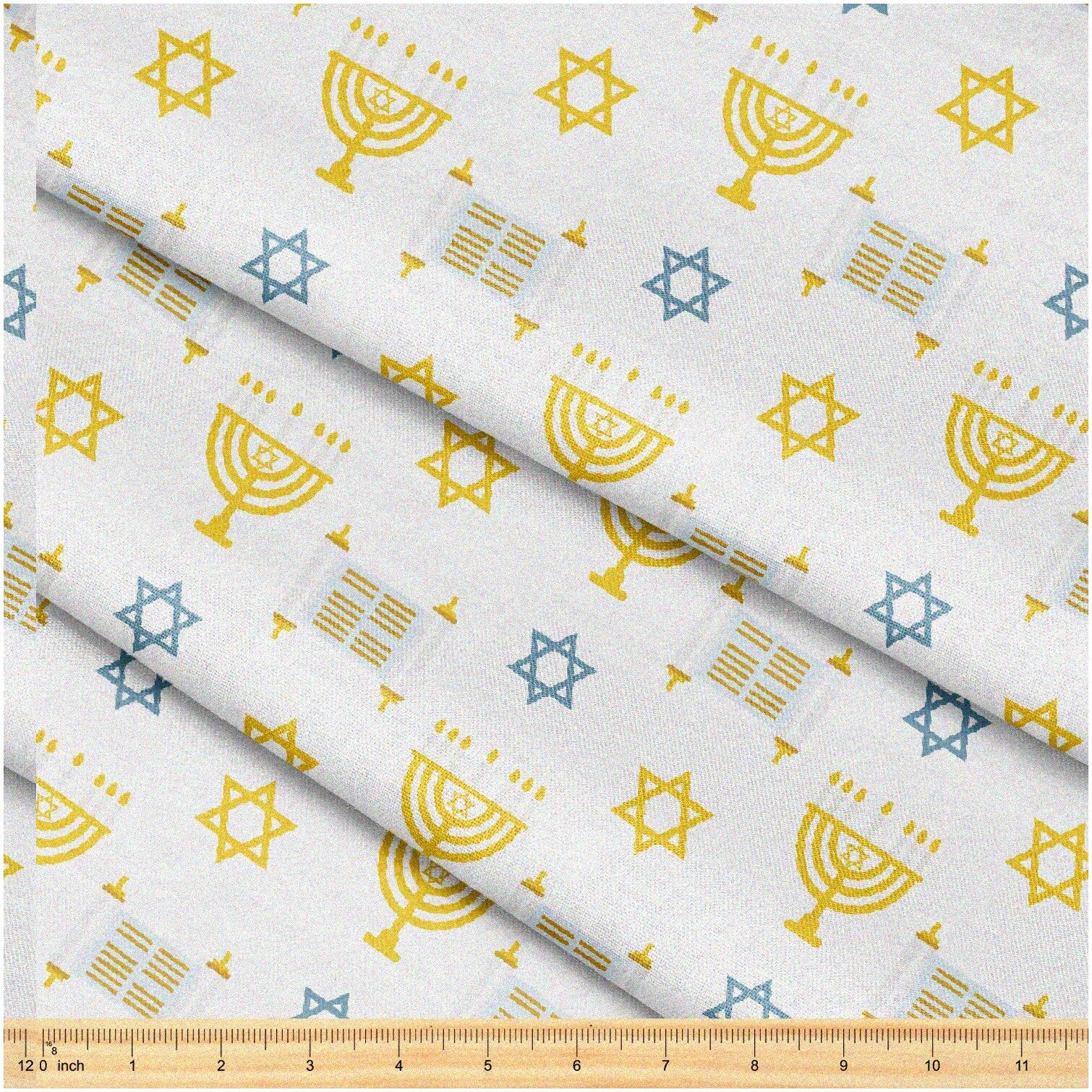 This decorative fabric measures 58 inches in width and 1 yard in length, featuring a captivating Hanukkah Menorah religious pattern. Its vibrant colors and intricate design add elegance and charm to sewing, quilting, apparel, and home decor projects. Crafted with high-quality materials, the fabric offers durability and resistance to wear and tear, ensuring long-lasting results. Its soft and supple texture makes it easy to cut, sew, and quilt, providing a smooth and precise experience for both beginners and experienced crafters. Whether creating a quilt, designing apparel, or enhancing home accents, this versatile fabric provides ample material to bring your creative ideas to life. The eye-catching pattern and superior craftsmanship make it a perfect choice for adding a touch of sophistication to your projects. Enjoy the combination of aesthetic appeal, quality, and ease of use with this versatile fabric.