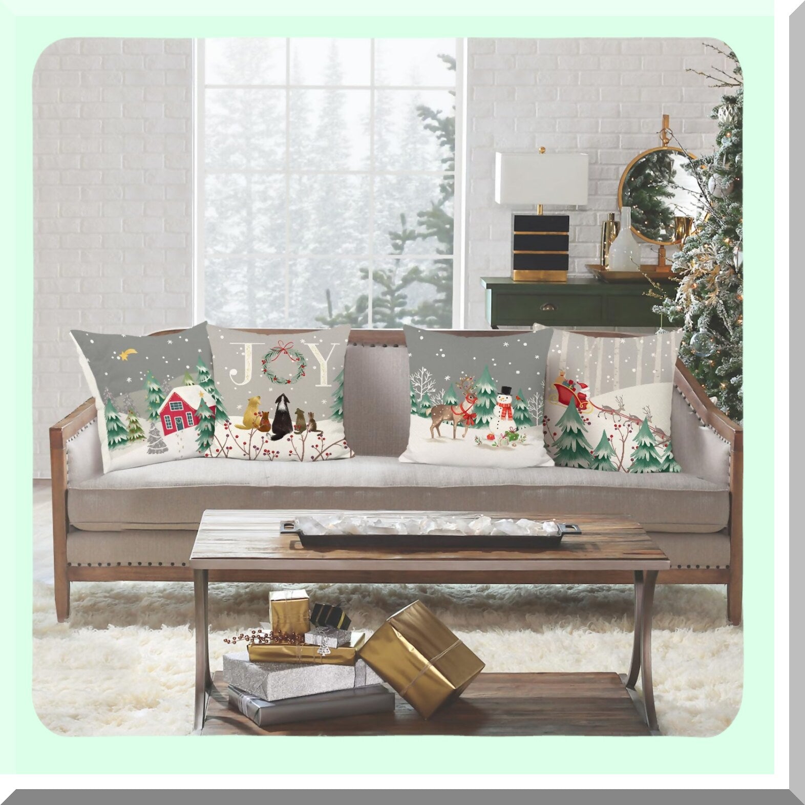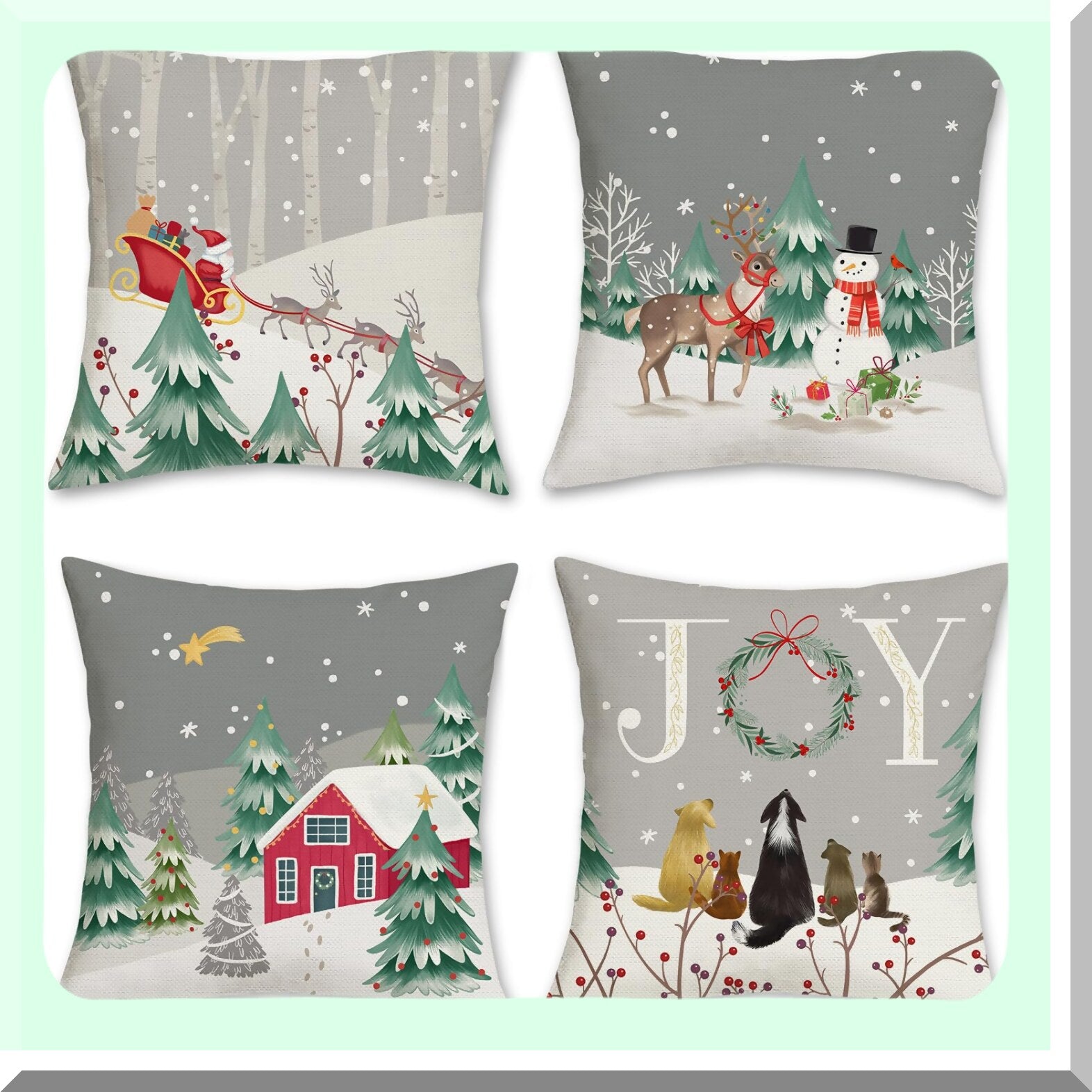 Winter Wonderland Holiday Pillow Covers - Set of 4 Snowy Pine Tree Snowman Reindeer Decorative Pillows for Couch Sofa Bed - 18x18 Inch Grey Snowflake Theme