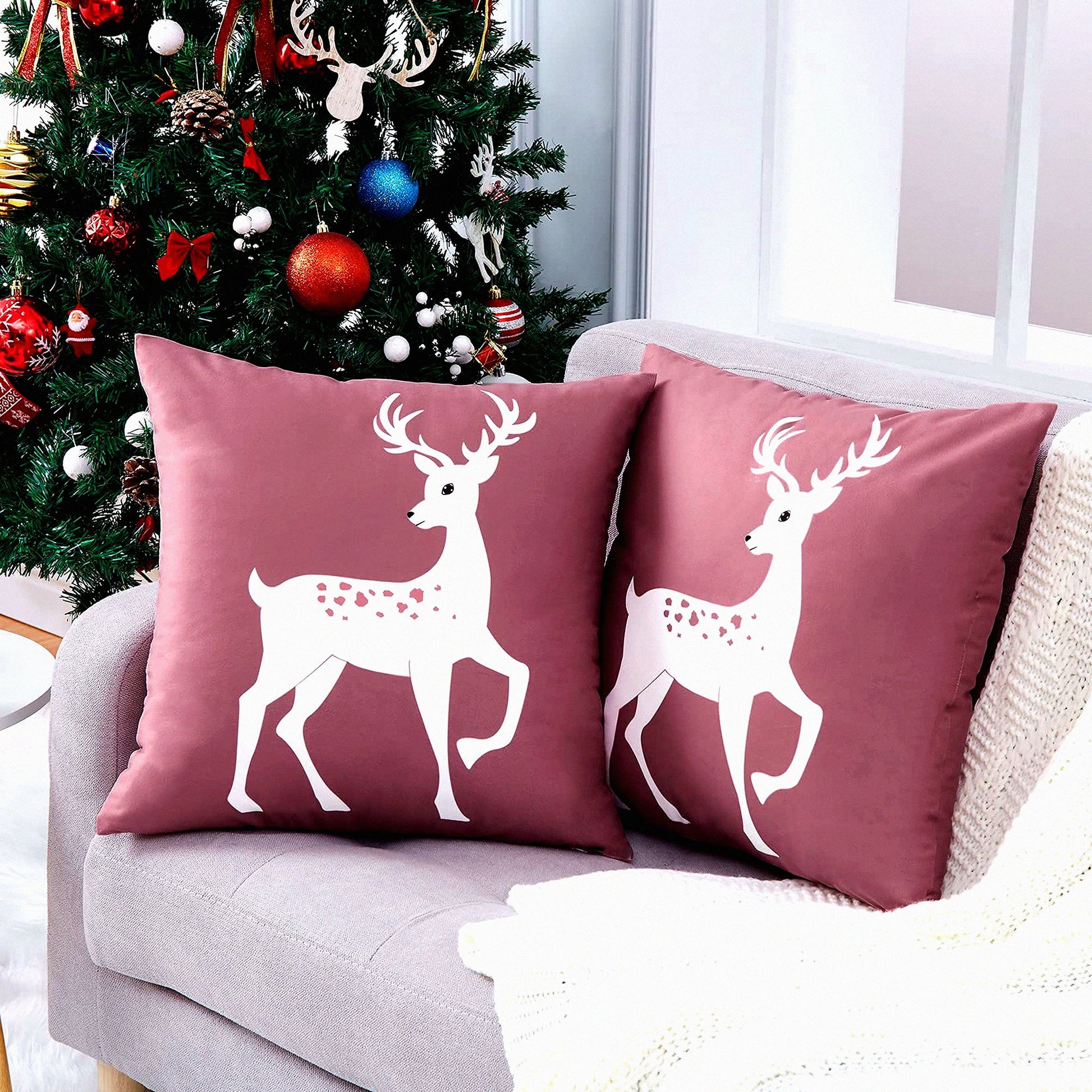 Winter Wonderland Deer Pillow Covers - Set of 2 Farmhouse Decorative Cushion Cases 18x18 Inch for Bedroom & Home Couch, Rustic Xmas Holiday Theme in Pink