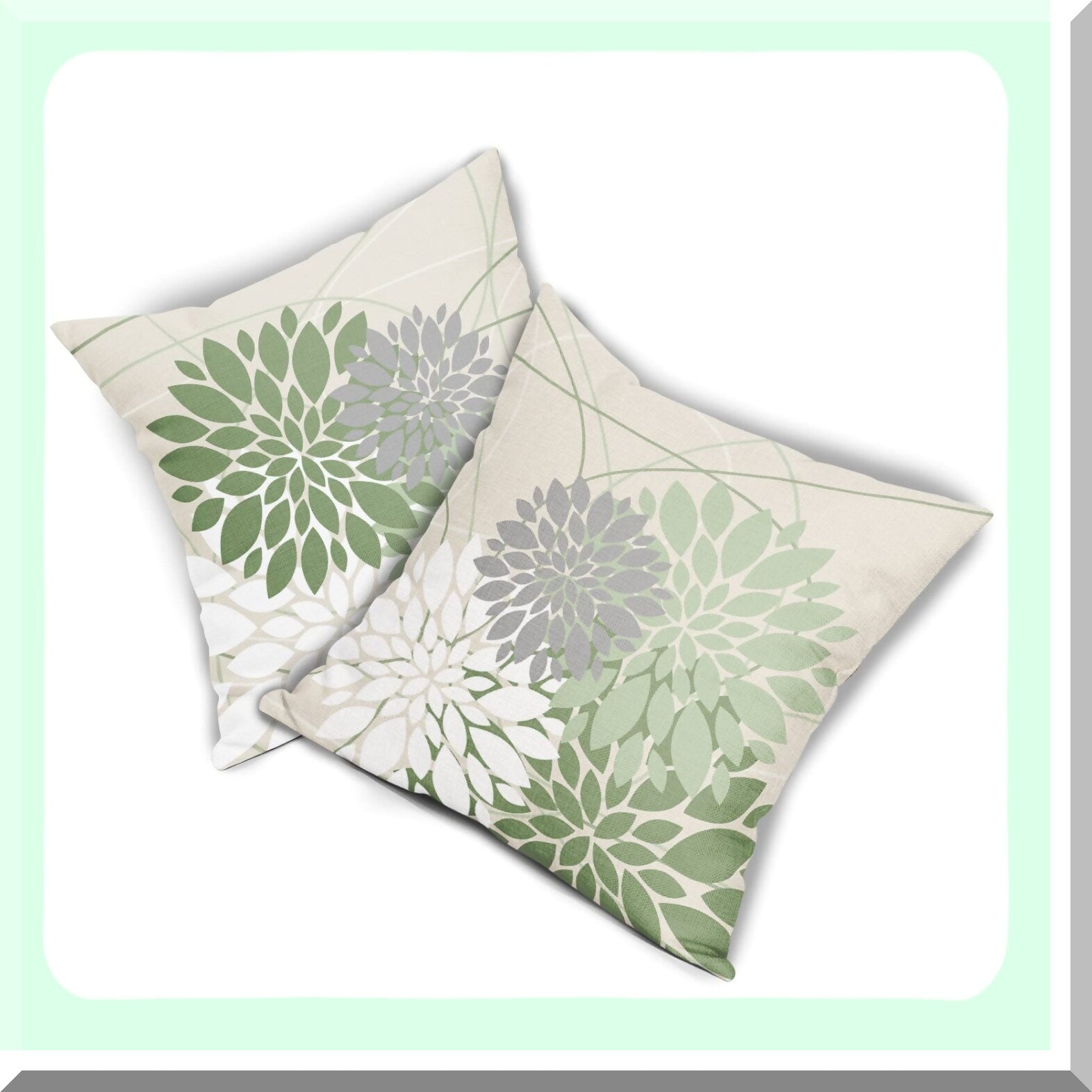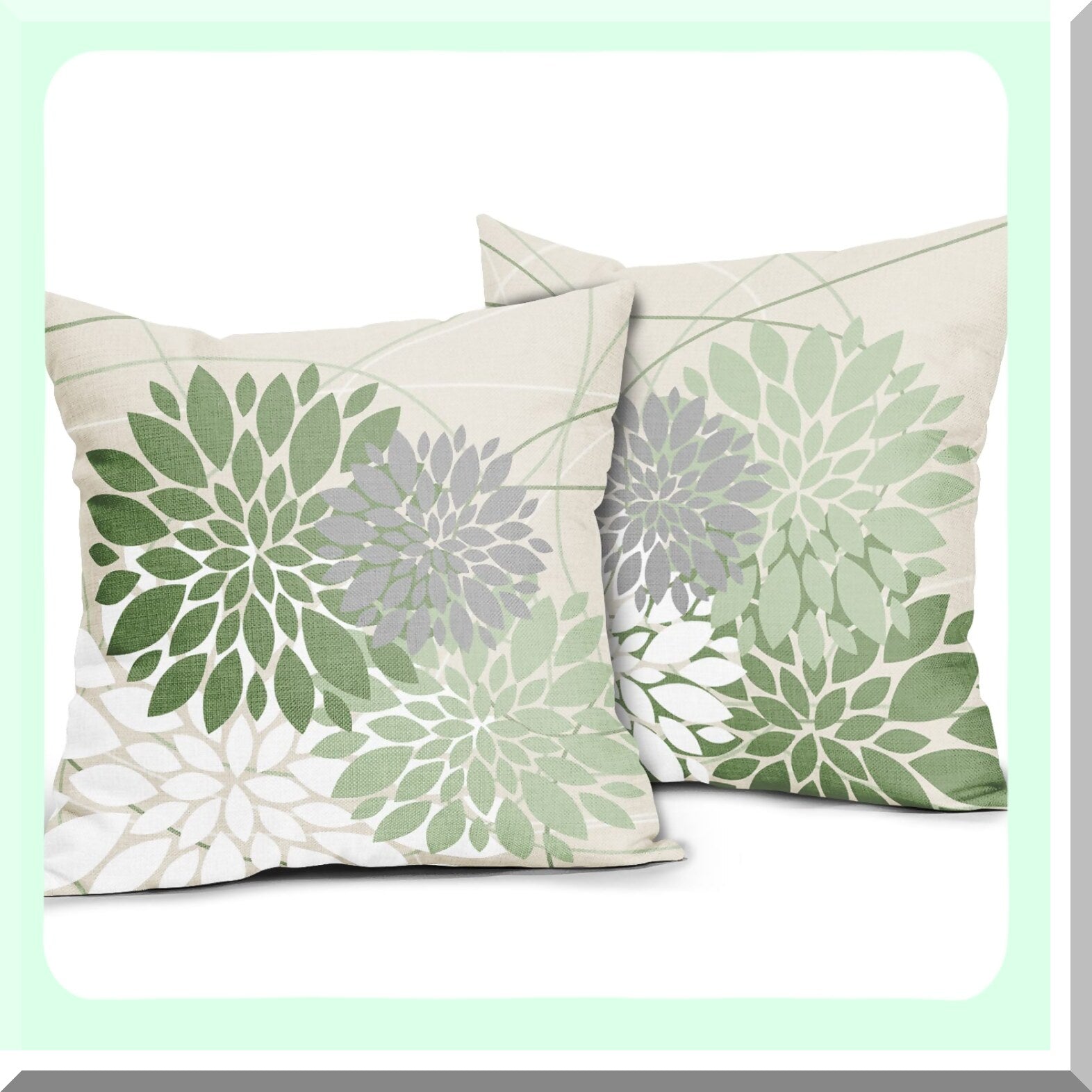 Spring Sage Green Dahlia Geometric Floral Pillow Covers - Set of 2 | Modern Farmhouse Linen Cushion Case for Home Bedroom Living Room Decor 18X18 Inch