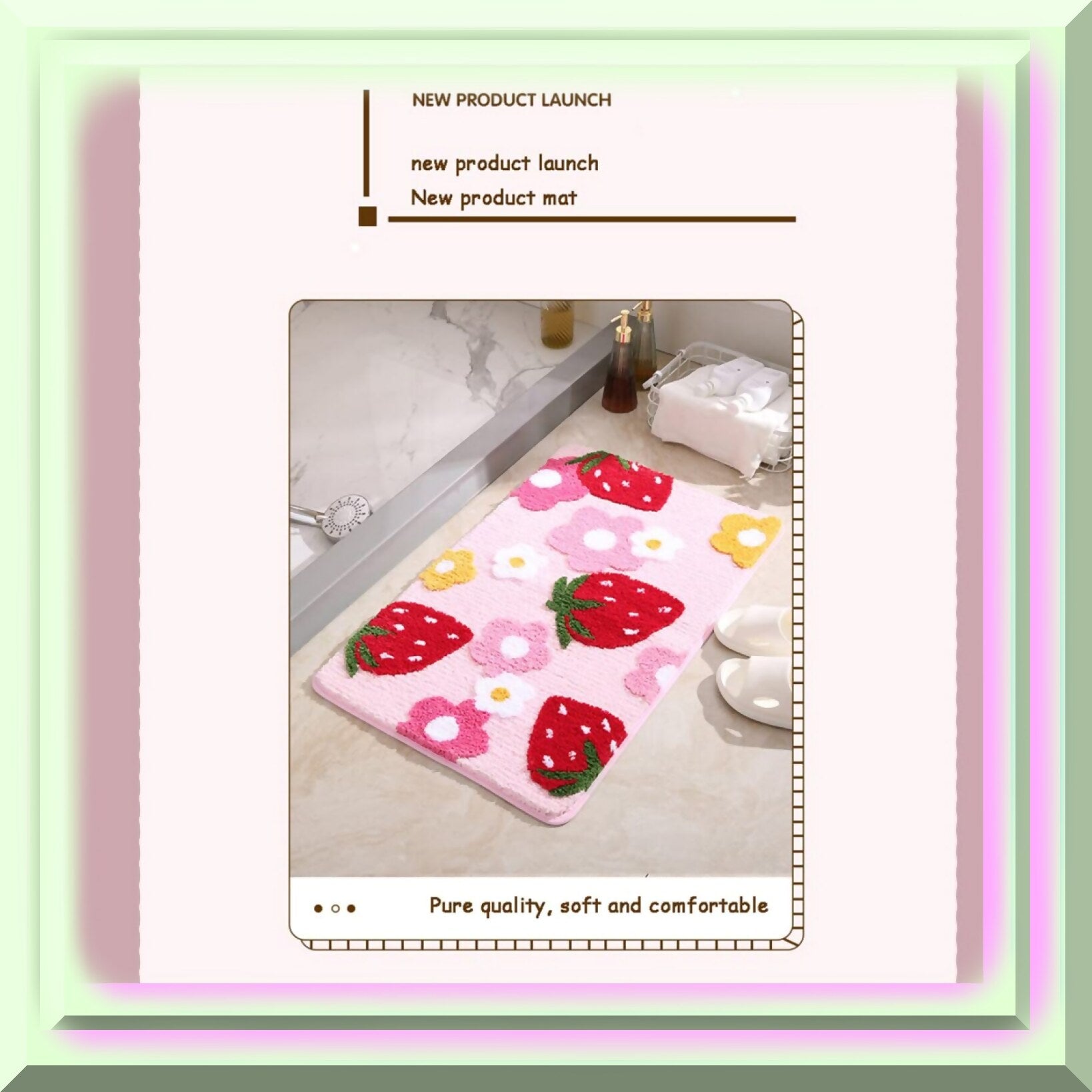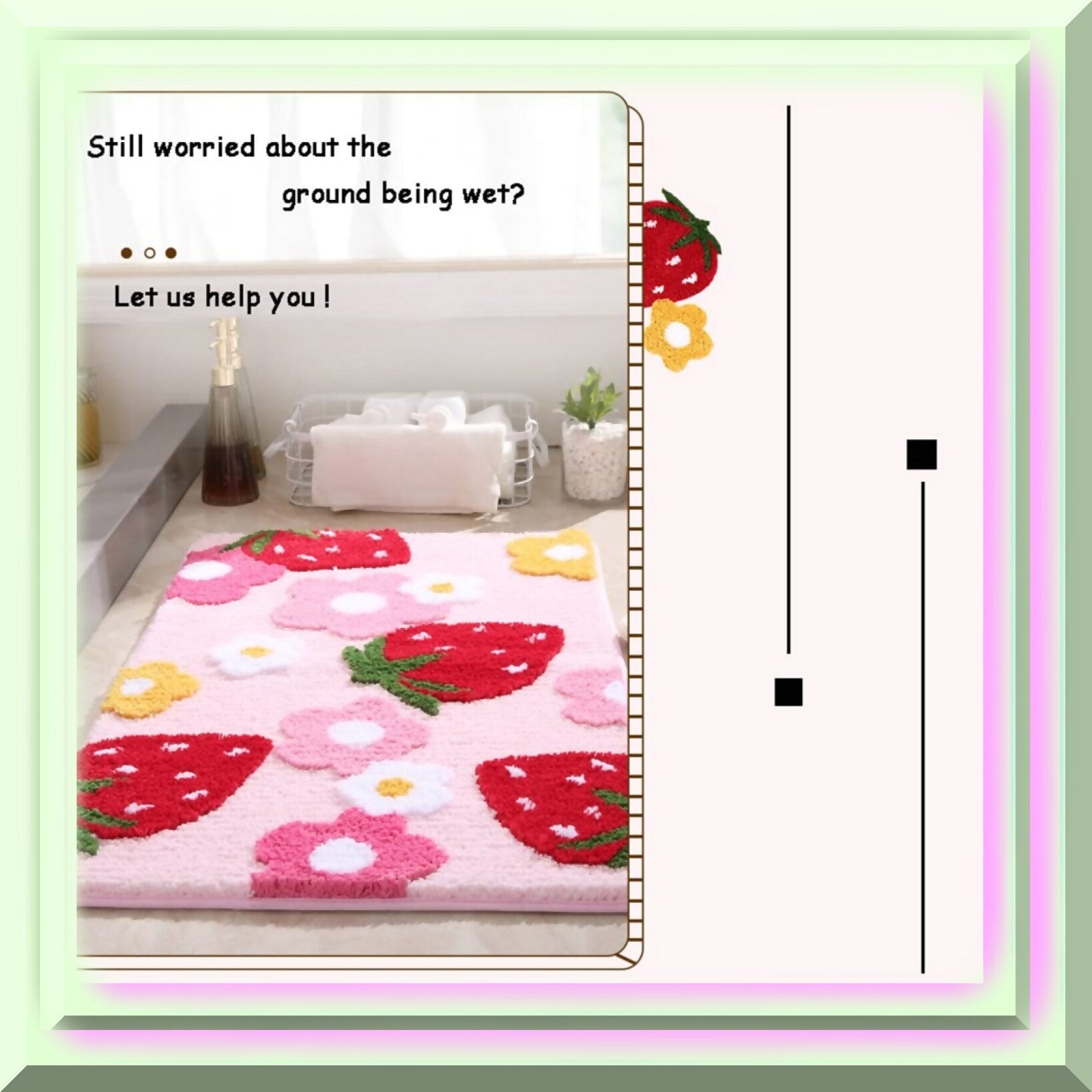 This soft and cozy bathroom rug features a charming strawberry design, adding a cute touch to any space. Made from 100% polyester with a TPR non-slip bottom, it provides safety and stability on various surfaces. The thick plush material offers comfort and warmth, making it ideal for bathrooms, bedrooms, living rooms, and entryways. Its high water absorption helps keep floors dry and clean, while the machine-washable design ensures easy maintenance. The rug dries quickly and is virtually non-shedding, maintaining its appearance over time. Suitable for indoor and outdoor use, it enhances decor while providing a soft surface underfoot. Its versatile size of 17.7" x 25.6" makes it perfect for tub sides, sinks, or any area where support and warmth are desired. Available in a variety of colors, this durable, stylish doormat combines functionality with a charming aesthetic, making it a practical addition to any home.