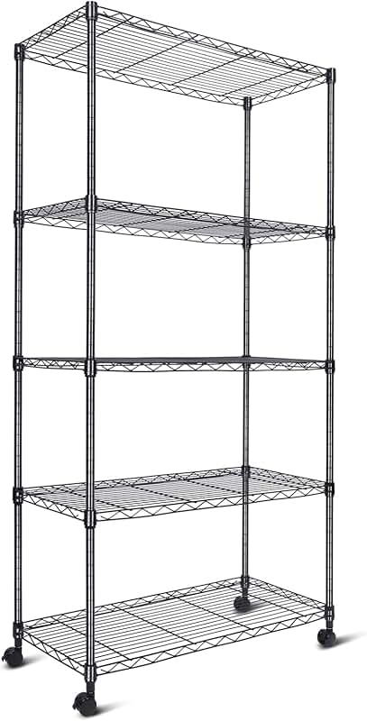 This five-tier shelving unit features adjustable storage shelves with wheels for easy mobility. Each shelf supports up to 400 pounds, providing a total capacity of 2000 pounds. The unit measures 30 inches in length, 14 inches in width, and 60 inches in height, making it suitable for various storage needs. Its sturdy construction allows for organized storage in pantries, kitchens, garages, or other spaces. The adjustable shelves enable customization to accommodate different items, while the wheels facilitate convenient movement and repositioning. The black finish offers a sleek appearance that can complement different environments. Designed for durability and versatility, this shelving unit helps maximize storage space efficiently. It is easy to assemble and provides a practical solution for organizing household or workshop items. The combination of strength, adjustability, and mobility makes it a functional addition to any storage area.