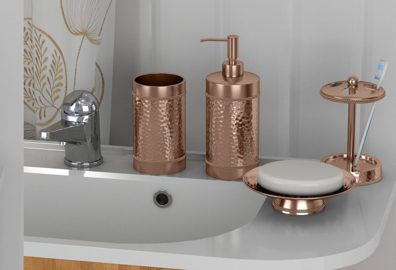 Enhance your bathroom with this modern 4-piece copper finish bath accessory set. Featuring a hammered textured surface and a two-tone copper finish, this ensemble adds a touch of timeless sophistication to any space. The set includes a soap dish, toothbrush holder, tumbler, and soap pump, providing a complete solution for your bathroom needs. Its sleek design combines contemporary style with subtle charm, making your bath area stand out with distinction. Crafted to elevate both aesthetics and functionality, this luxury set offers a cohesive look that complements various decor styles. Perfect for creating a polished and organized bathroom environment, each piece is designed to blend seamlessly into your daily routine. Whether updating an existing space or designing a new one, this 4-piece set delivers a refined and practical addition to your bathroom decor.