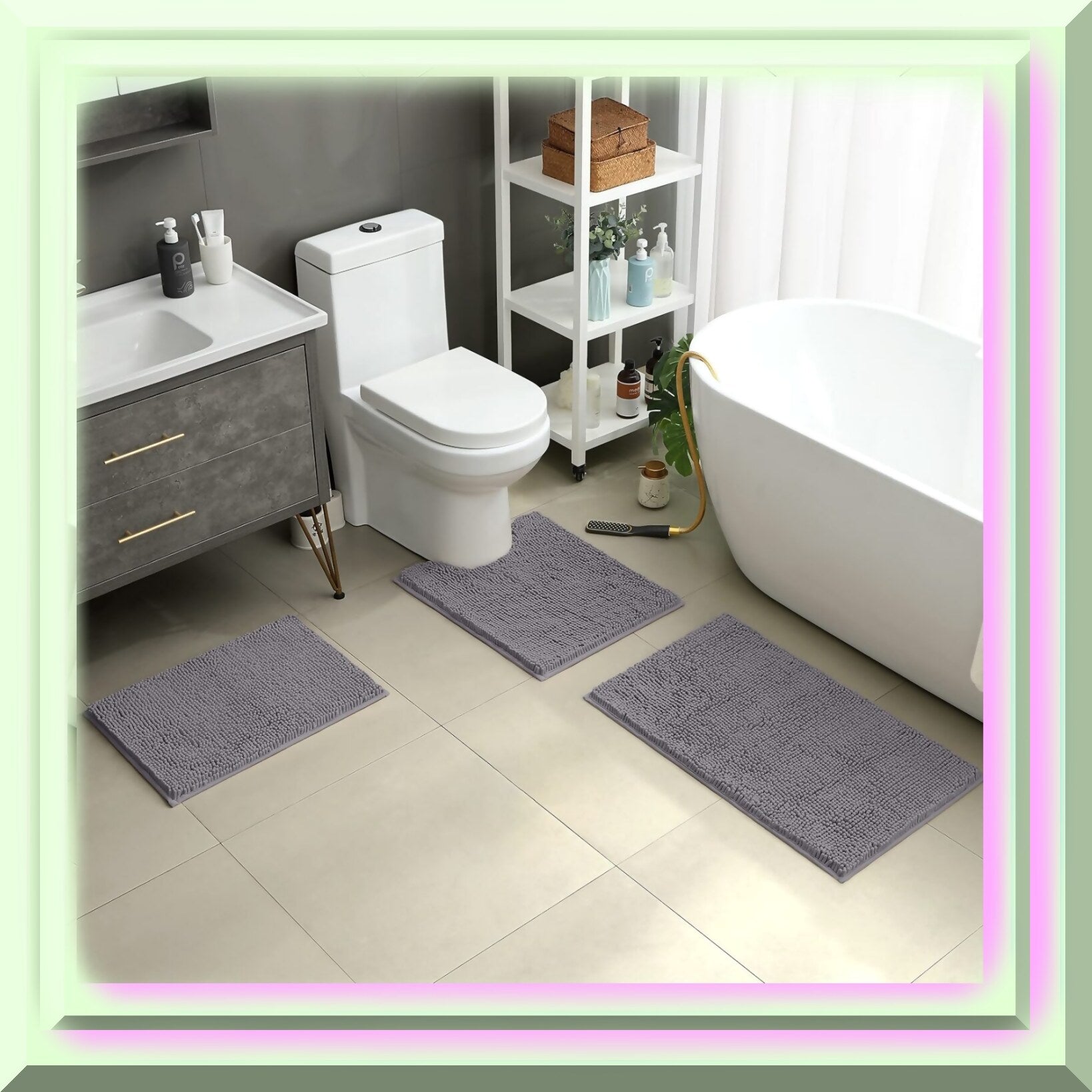 3-Piece Grey Bathroom Rug Set with Non-Slip Chenille