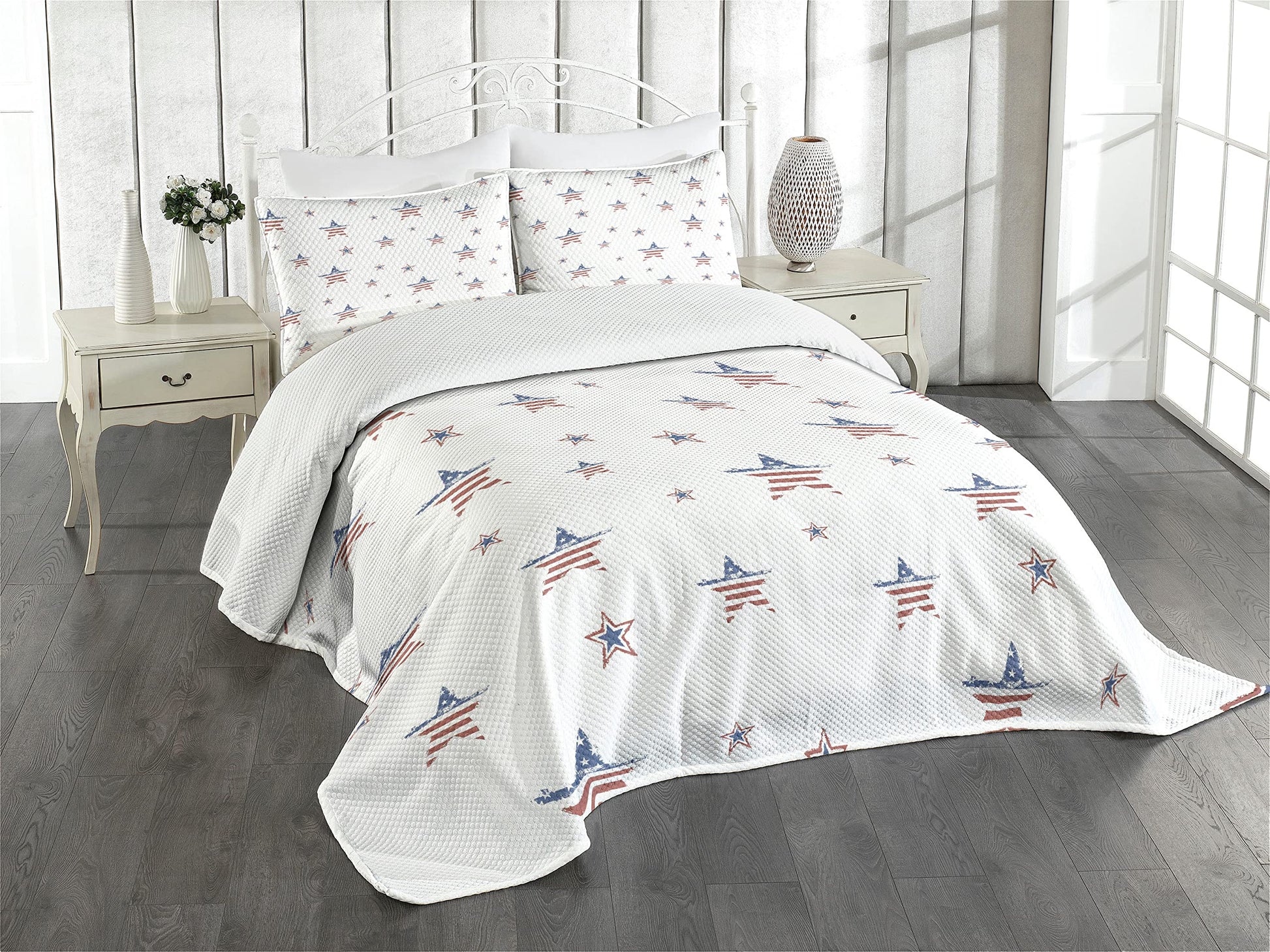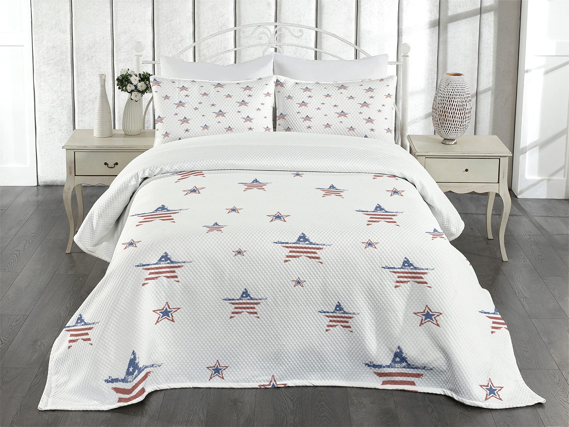 4th of July Bedspread, Scattered Stars with Flag Motifs Independence Day Theme, Decorative Quilted 3 Piece Coverlet Set with 2 Pillow Shams, Queen Size, Ruby Navy Blue White