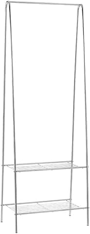 This stainless steel clothing rack features a sturdy design with multiple shelves, providing ample space for organizing garments and accessories. Its heavy-duty construction ensures durability and stability, making it suitable for use in bedrooms, offices, or retail spaces. The rack includes integrated shoe storage, helping to keep footwear organized and easily accessible. Its freestanding design allows for flexible placement without the need for wall mounting. The assembly process involves bolts, ensuring a secure and stable structure. The sleek stainless steel finish adds a modern touch, complementing various interior styles. Ideal for maximizing storage in limited spaces, this versatile garment organizer helps maintain a tidy environment. Its robust build and functional design make it a practical addition for those seeking an efficient storage solution for clothing and footwear.