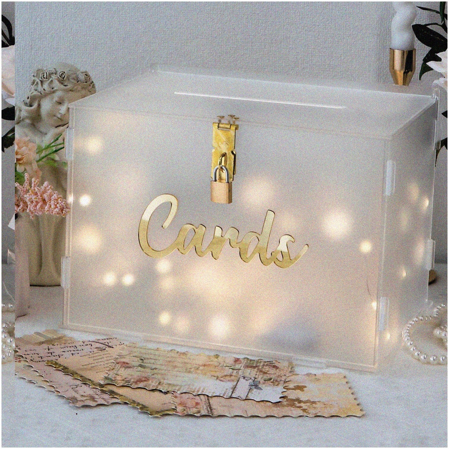 Celebrate your special moments with this elegant sparkling memory card chest featuring a lock. Crafted from frosted acrylic with a matte texture, it offers a refined appearance that enhances any event. The illuminated design creates a warm, inviting glow, making it a striking addition to your party decor. The lock ensures the security of your cherished cards and gifts, keeping them safe throughout the celebration. This versatile money envelope box is suitable for weddings, graduations, baby showers, and other festive gatherings. Its sleek design combines functionality with elegance, helping to create memorable experiences. Whether marking a milestone or hosting a joyful event, this stylish decor piece adds charm and practicality to your setup. Perfect for making your celebration truly unforgettable, it serves as a beautiful and secure holder for cards and gifts, elevating the overall ambiance of your special occasion.