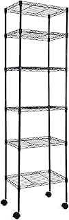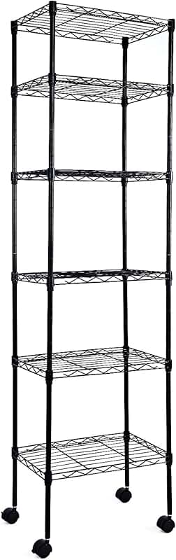 This 6-tier storage shelving unit features adjustable shelves, allowing customization to fit various storage needs. The unit measures 17.32 inches wide, 11.42 inches deep, and 64.96 inches high, providing ample vertical space for organizing different items. Equipped with wheels, it offers easy mobility for repositioning within a space. The shelves are designed to hold a variety of household or workshop items, helping to maximize storage efficiency. Hanging hooks are included to hang tools, accessories, or other small items, enhancing organization. The black finish gives it a sleek appearance suitable for different environments. The adjustable design makes it versatile for use in garages, basements, kitchens, or offices. Its sturdy construction ensures stability and durability for everyday use. This shelving unit is a practical solution for creating additional storage space while maintaining easy access to stored items.