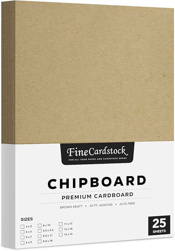 This medium-weight brown kraft chipboard measures 8.5 inches by 14 inches and is 30 points (0.03 inch) thick. It is sturdy and versatile, suitable for arts and crafts projects, packaging, scrapbooking, and backing notepads. The package includes 25 sheets of thick, durable cardboard, providing a reliable surface for various creative and practical uses.