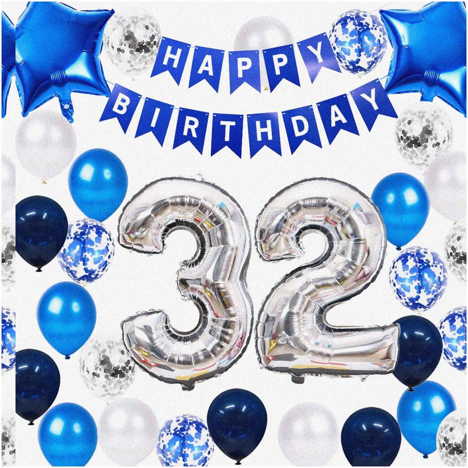 Celebrate a 32nd birthday with this vibrant decoration kit. It includes a 'HAPPY BIRTHDAY' letter banner with letters measuring 4.5" by 6.3", a large 32-inch number-shaped balloon, and two star-shaped balloons. The set features 25 latex balloons in five styles: blue, white confetti, white, navy blue, and blue confetti, each standing 12 inches tall. A 10-meter ribbon completes the collection, perfect for creating a festive atmosphere. These decorations are reusable, making them suitable for multiple celebrations. Designed to add a colorful and coordinated look to any birthday party, this kit is ideal for marking 32 years of celebration with style.