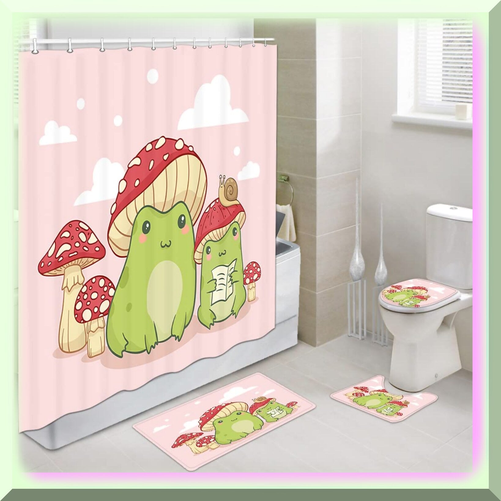 This cute shower curtain set includes a 69 x 70-inch polyester fabric curtain with waterproof properties, along with matching bathroom accessories. The set features a bath mat measuring 29 inches long and 17 inches wide, a U-shaped bath rug 17 inches long and 14 inches wide, and a lid cover 17 inches long and 13 inches wide. The package contains one shower curtain, twelve strong plastic hooks, one bath mat, one lid cover, and one U-shaped rug. The flannel bath rugs and U-shaped mat are soft, comfortable, and textured. Easy to install and care for, the set is machine washable on a gentle cold cycle, and can be cleaned with a quick rinse or wipe after use. It is waterproof and durable, suitable for daily bathroom use. Please note that slight size variations may occur due to manual measurement, and colors may vary slightly depending on monitor settings. For creases, gentle ironing is recommended.
