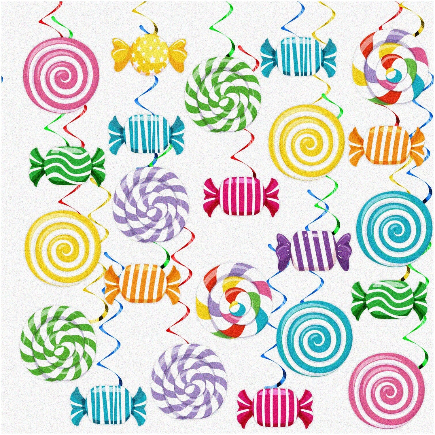 Add a burst of color and whimsy to your celebration with these vibrant hanging swirl decorations. Designed to enhance any party setting, they are perfect for decorating ceilings, doorways, arches, and more. Made from high-quality paper and plastic, these durable decorations are built to last throughout your event. The set includes 24 colorful candy-themed cutouts and 24 hanging spirals in four lively colors, totaling 48 pieces. Their playful design creates a cheerful atmosphere, making them ideal for birthday parties, baby showers, and themed celebrations. These versatile decorations are easy to hang and instantly transform your space into a sweet shop wonderland. Bright, fun, and eye-catching, they add a festive touch to any occasion, bringing joy and vibrant color to your event. Perfect for creating memorable moments and a lively party environment. Features: 48 Pieces Include You will receive: 24 pieces candyland cutouts; 24 pieces single spirals in 4 colors.