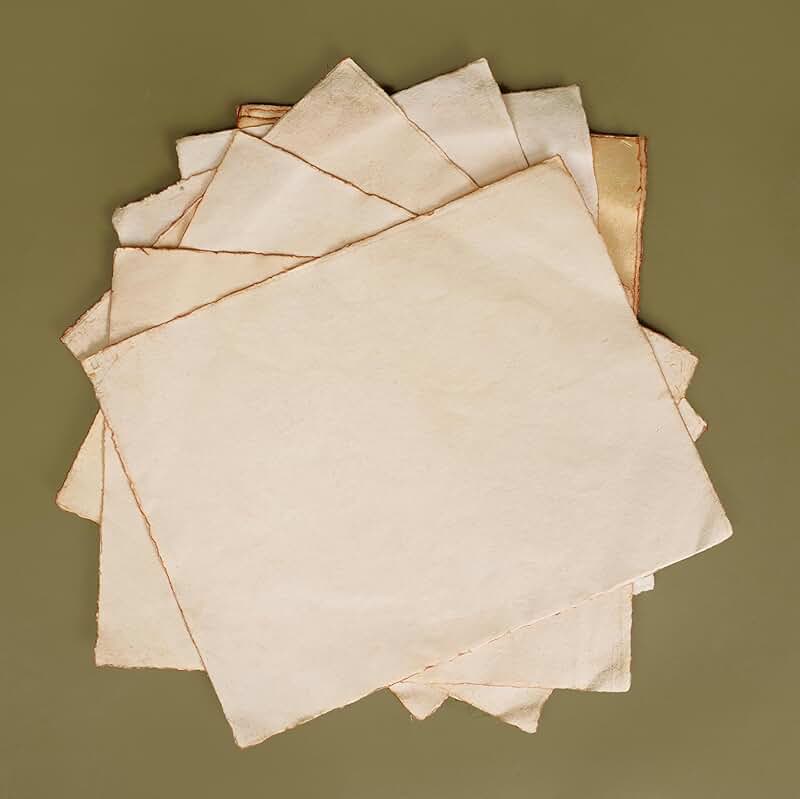 This set includes 50 sheets of vintage-style handmade paper, each measuring 8.5 by 11.5 inches with a deckle edge. The paper has a rustic, antique appearance and a weight of 150 GSM, making it suitable for various creative projects. It can be used for writing, printing, invitations, scrapbooking, art, and DIY crafts.