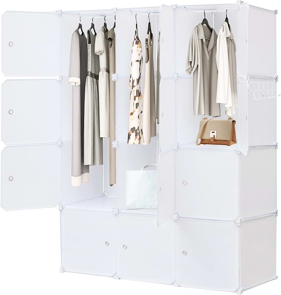 This DIY assemble wardrobe closet features a versatile design with 14"x18" depth cubes, suitable for organizing clothes and accessories. The storage unit can be configured as a floor-standing or wall-hanging system, providing flexible placement options to fit various spaces. Constructed with sturdy materials, it offers reliable weight-bearing capacity to hold clothing, shoes, and other personal items securely. The design includes patented buckles that ensure stability and easy assembly, making it convenient to set up and customize. The unit consists of 3 rows and 4 columns of cubes, creating a compact and organized storage solution. Its clean white finish adds a neutral touch that complements different interior styles. Ideal for bedrooms, closets, or living areas, this modular storage system helps maximize space and keep belongings neatly arranged. Durable and practical, it offers a customizable solution for everyday organization needs.