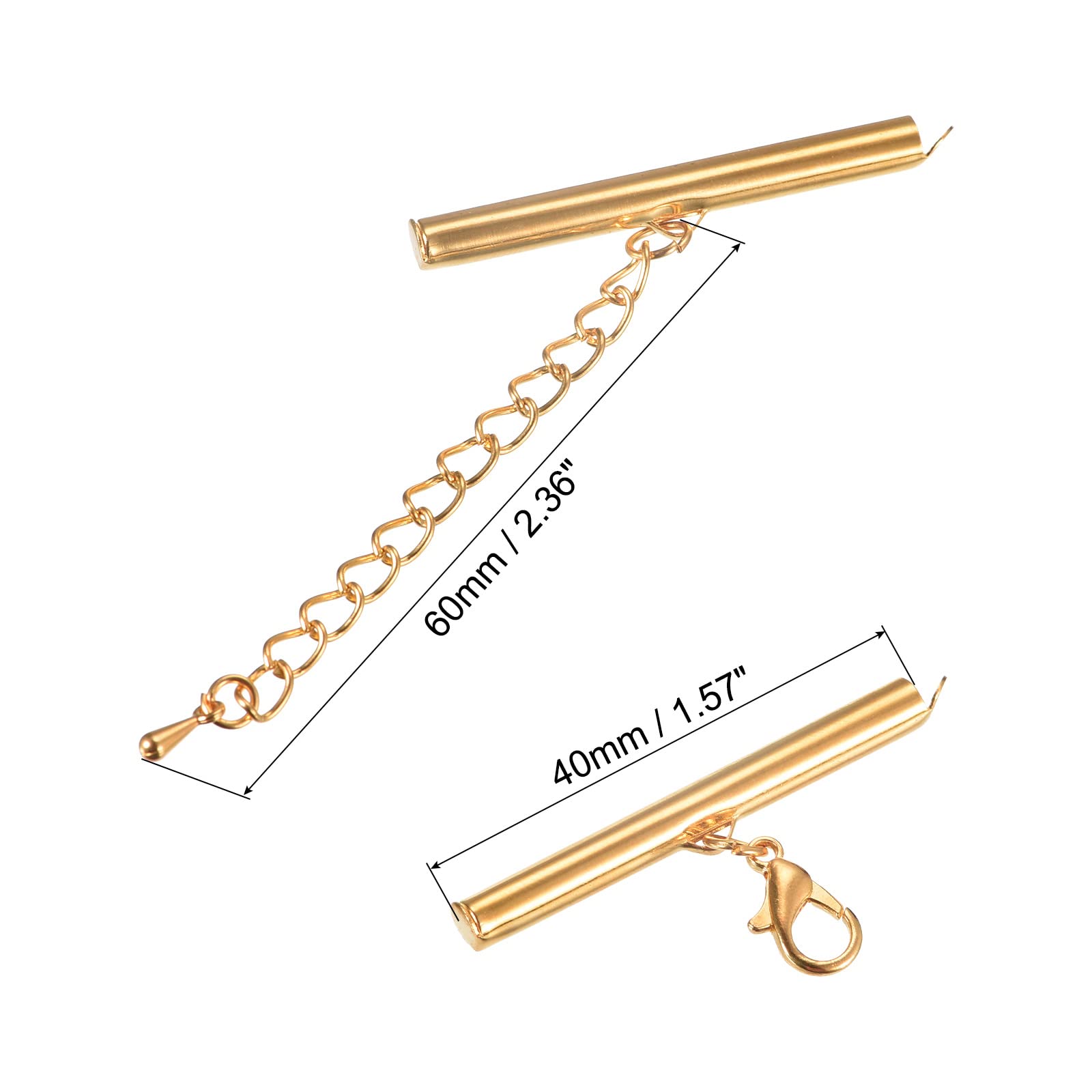 Sturdy cord end clips made of electroplated iron offer durability and resistance to fading and rust, ensuring long-lasting use. These tube slide design clasps feature a lobster claw clasp and extension chain, allowing easy length adjustment and customization by adding or removing jump rings. The tube shape enables quick attachment to various bead chains, fabrics, lace, or string wires, making them versatile for different craft projects. Simple to use, just slide the end of your project through the clamp slot, secure with the end cap, and repeat on the other side. The jump ring chain length can be adjusted to fit your needs. Ideal for DIY jewelry and craft making, these clasps are suitable for creating chokers, bracelets, pendants, keychains, and lanyards. Each package includes 10 sets of light golden slide end clasps with lobster claw clasps and extension chains, providing ample supplies for various creative projects.