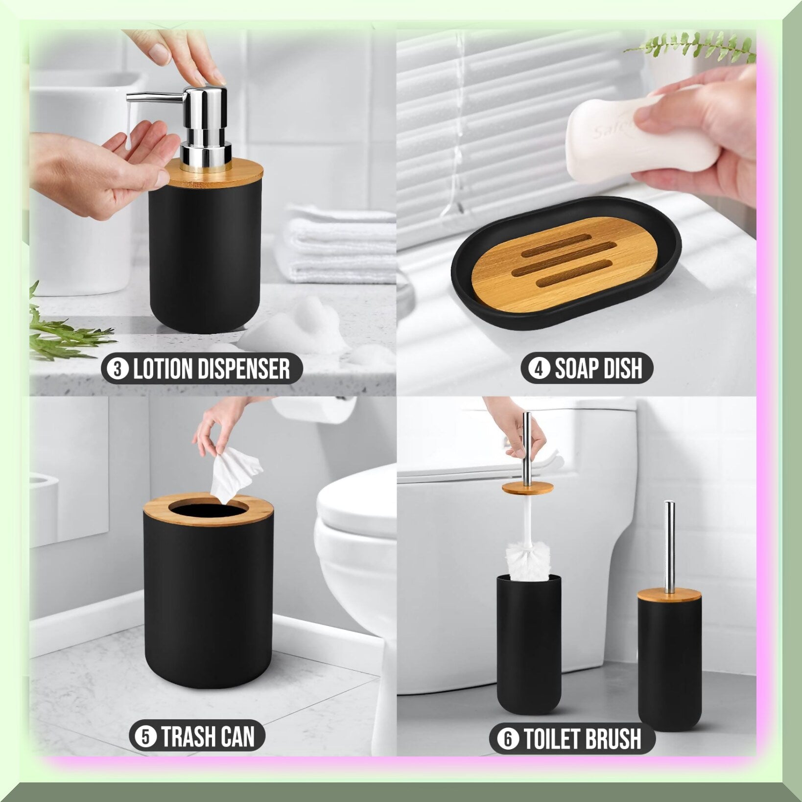 This 6-piece bathroom accessory set includes a toothbrush holder, toothbrush cup, soap dispenser, soap dish, tet brush with holder, and trash can, along with three soft-bristled toothbrushes. The trash can features a lid and a spacious interior suitable for small items like cotton swabs and makeup remover pads, making it ideal for bathroom, bedroom, or kitchen use. The tet brush with bracket is designed to reach deep into pipelines and corners for effective cleaning, with a convenient storage bracket. The soap dish has a leak-proof design to keep soap dry and features a bamboo bottom that adds a natural touch. The emulsion dispenser is perfect for lotions, shower gels, and shampoos. The toothbrush holder has holes in the cover to store multiple toothbrushes, while the plastic toothbrush cup complements the set’s aesthetic. The set emphasizes a natural look with bamboo elements and includes three soft-bristled toothbrushes for daily use.