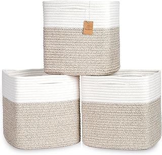 These 13-inch cube storage bins are crafted from durable cotton rope, offering a stylish and practical solution for organizing various spaces. The woven baskets feature a sturdy fabric lining that helps keep contents secure and protected. Ideal for use on shelves, in closets, or as toy bins, they provide a versatile storage option for bedrooms, nurseries, or playrooms. The compact size makes them suitable for organizing small items, toys, clothing, or accessories, helping to reduce clutter and maintain order. Their neutral design complements different interior styles, adding a touch of natural texture to any room. The set includes three baskets, making it easy to create a coordinated storage system. Lightweight yet sturdy, these baskets are easy to move and clean, making them a practical addition to any home. Their simple, functional design enhances organization while maintaining a tidy and inviting environment.