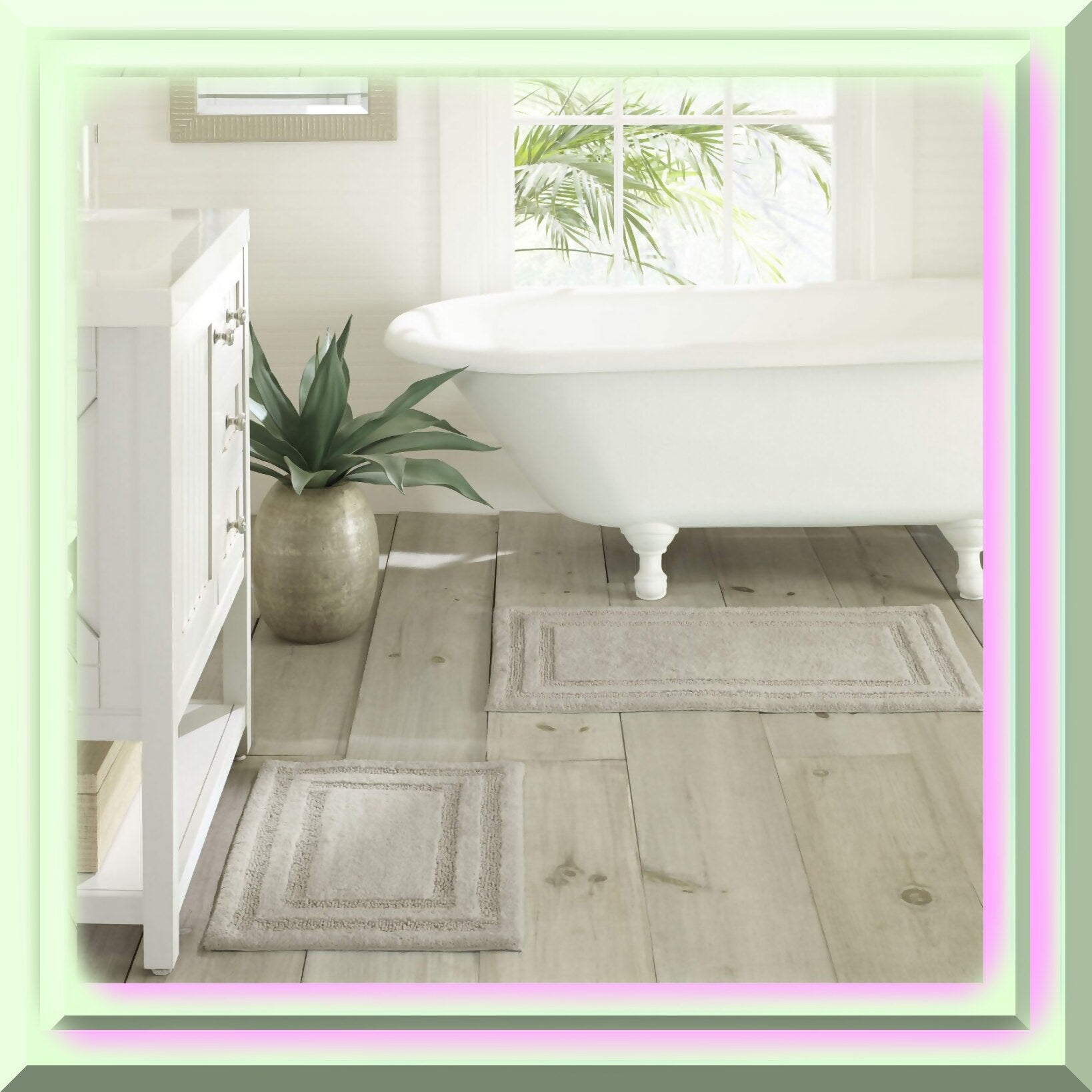 This set includes two highly absorbent cotton bath rugs designed to enhance your bathroom decor. Made from 100% tufted cotton, these rugs offer a soft touch and a resilient surface. The smaller rug measures 17"L x 24"W, while the larger one is 21"L x 34"W, making them suitable for use near your vanity, bathtub, or shower. The Isla pattern features a tufted border on a light grey ground, adding a modern touch to your space. These rugs are low linting and machine washable for easy maintenance. Available in several beautiful color options, they coordinate well with various shower curtains and bath accessories. Perfect for adding both style and functionality, these plush bath rugs are a practical addition to any bathroom.