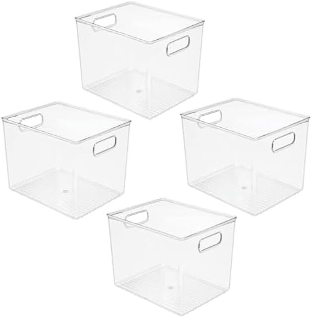 These plastic storage bins are designed for organizing kitchen and pantry spaces. They feature a tall, deep design with sturdy handles for easy lifting and transport. Ideal for storing food items, they help maximize space in cabinets, refrigerators, and freezers. The clear construction allows for quick identification of contents, reducing clutter and improving accessibility. The four-pack provides versatile options for grouping similar items or creating organized sections within your storage areas. Made from durable plastic, these bins are easy to clean and maintain. Their versatile design makes them suitable for various storage needs, helping to keep your kitchen tidy and organized. The bins are lightweight yet sturdy, making them convenient for daily use. Whether used for snacks, canned goods, or frozen foods, these storage solutions help optimize space and improve overall kitchen organization.