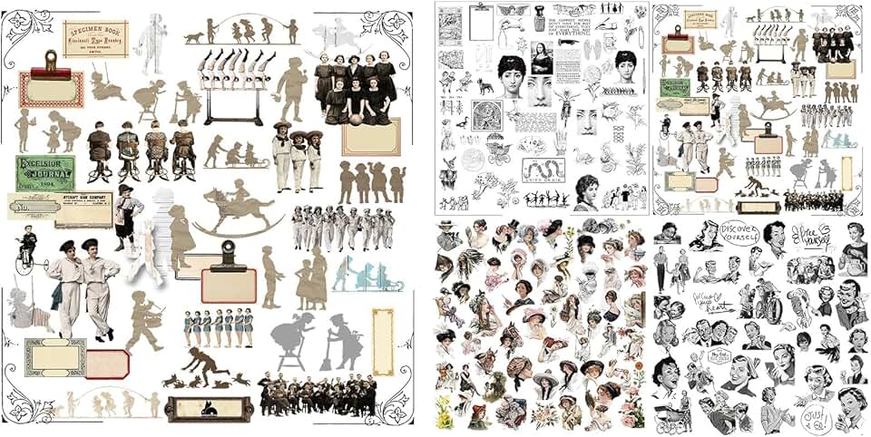 This set includes five packs of junk journal supplies featuring translucent stickers, vintage ephemera, character sketches, and retro characters. Perfect for adding unique decorative elements to scrapbooks and journals, these supplies offer a variety of designs and textures. The translucent stickers can be layered or used alone to enhance your projects, while the vintage ephemera and character sketches provide nostalgic and artistic touches. Ideal for creative journaling, collage work, and mixed media art, these supplies help personalize and enrich your craft projects with a vintage and retro aesthetic.
