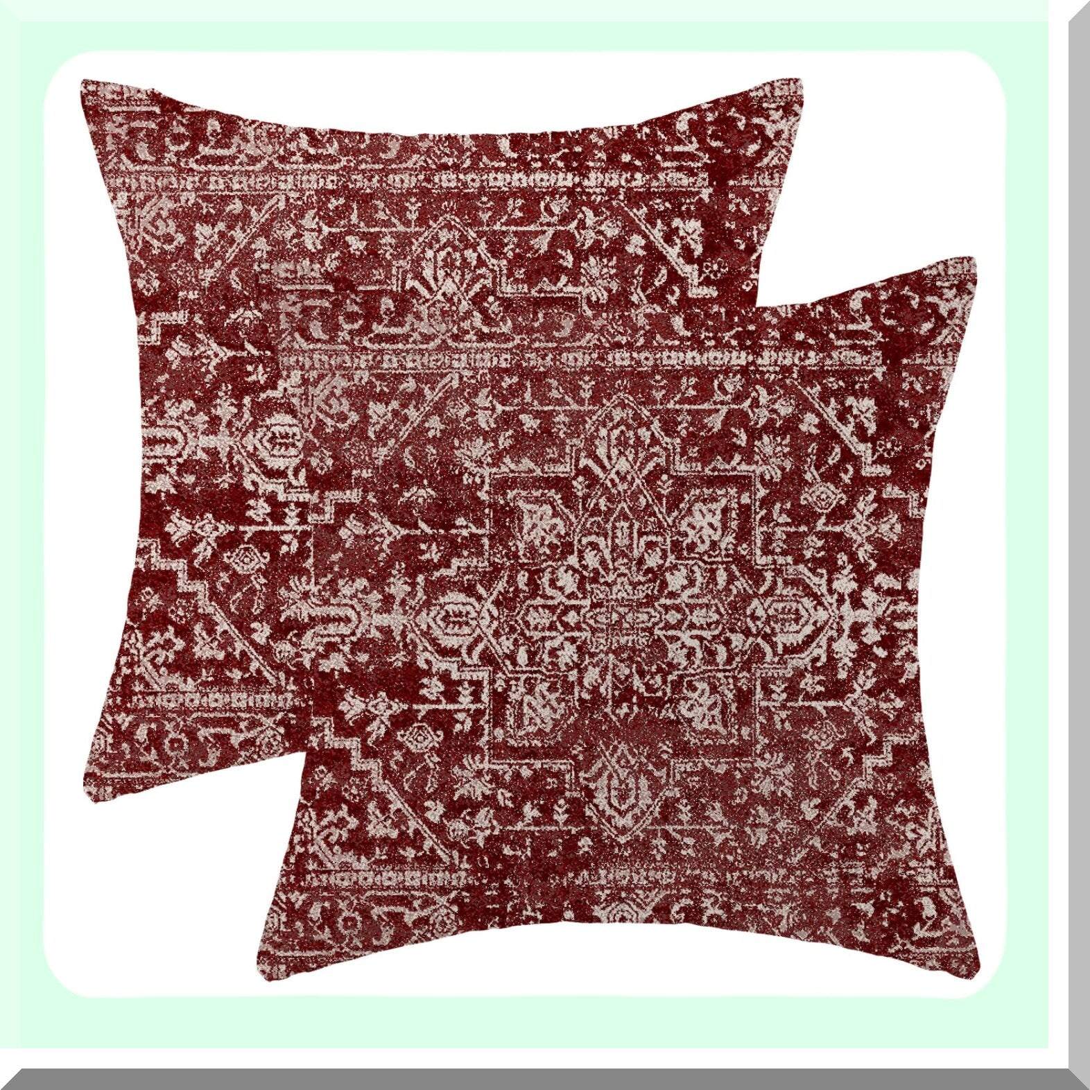 Burgandy Boho Linen Pillow Covers Set - Ethnic Farmhouse Decorative Throw Cushions 18x18 for Sofa Couch Outdoor - Red Carpet Pattern