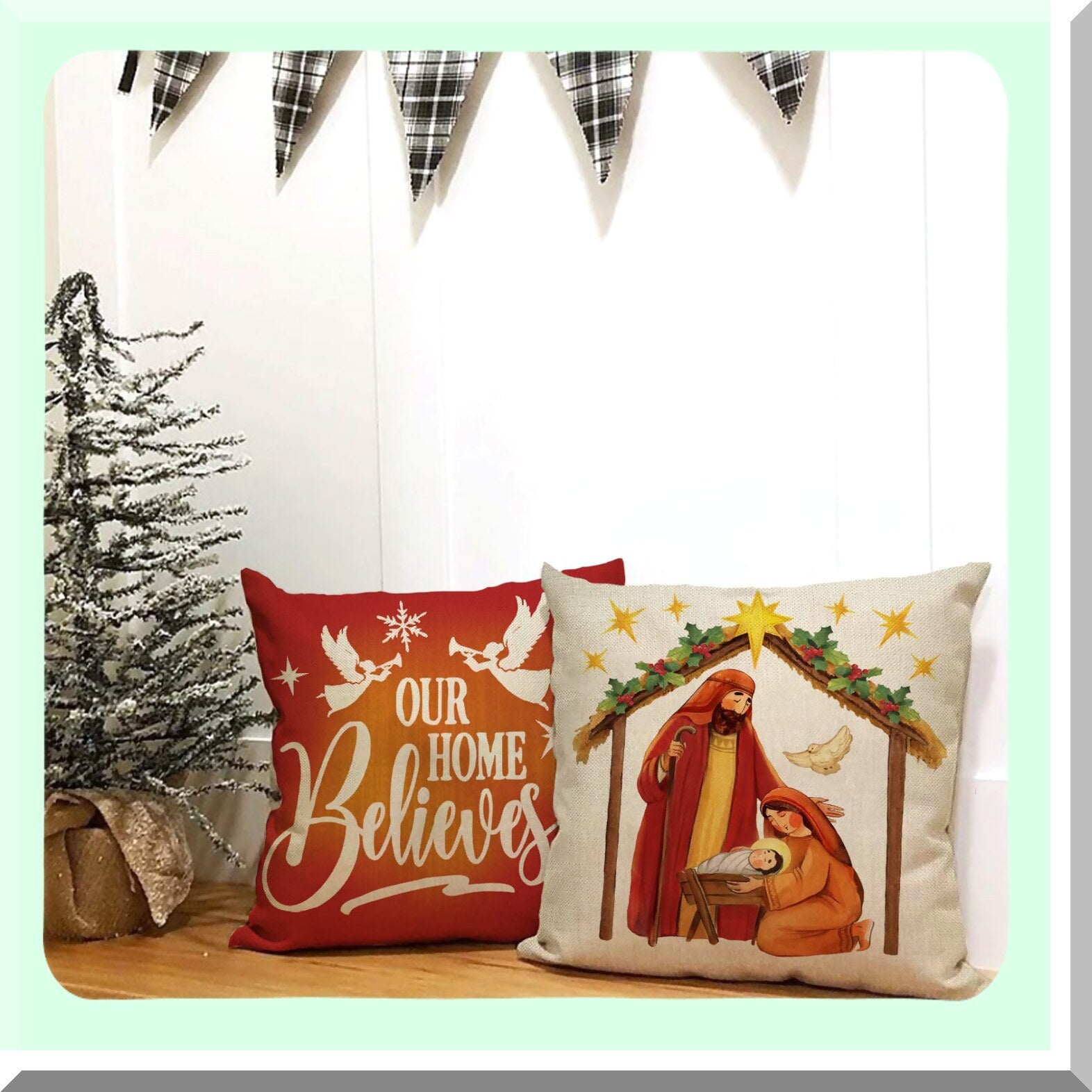Christian Joy Christmas Pillow Cover Set - Cross Angel Dove Snowflake Decorative Cushion Case for Sofa Couch 18x18 - Nativity Poinsettia Xmas Theme