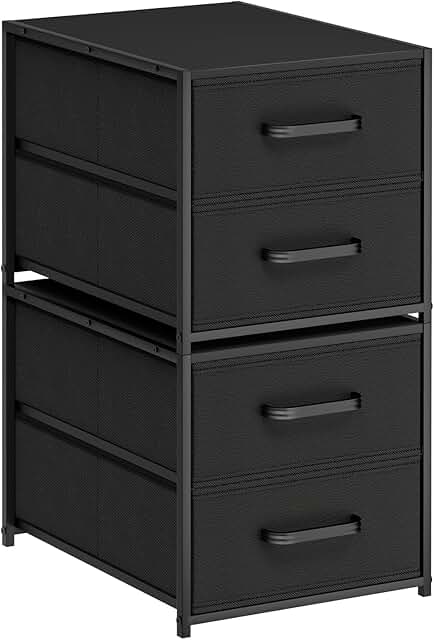 These stackable storage drawers are designed with two tiers, providing organized space for various items. Each drawer features sturdy metal handles for easy access and secure stacking. The fabric construction offers a lightweight and flexible solution for bedroom, dorm, or office storage needs. The collapsible bins allow for convenient storage and space-saving when not in use. Suitable for organizing clothing, accessories, or office supplies, these versatile drawers help maximize storage efficiency. The neutral black color complements different decor styles, making them a practical addition to any room. The set includes two units, offering ample storage options in a compact design. Durable and easy to assemble, these fabric drawers are ideal for creating tidy, accessible storage in small or cluttered spaces. Their simple design and functional features make them suitable for various environments, including bedrooms, dorm rooms, and offices.
