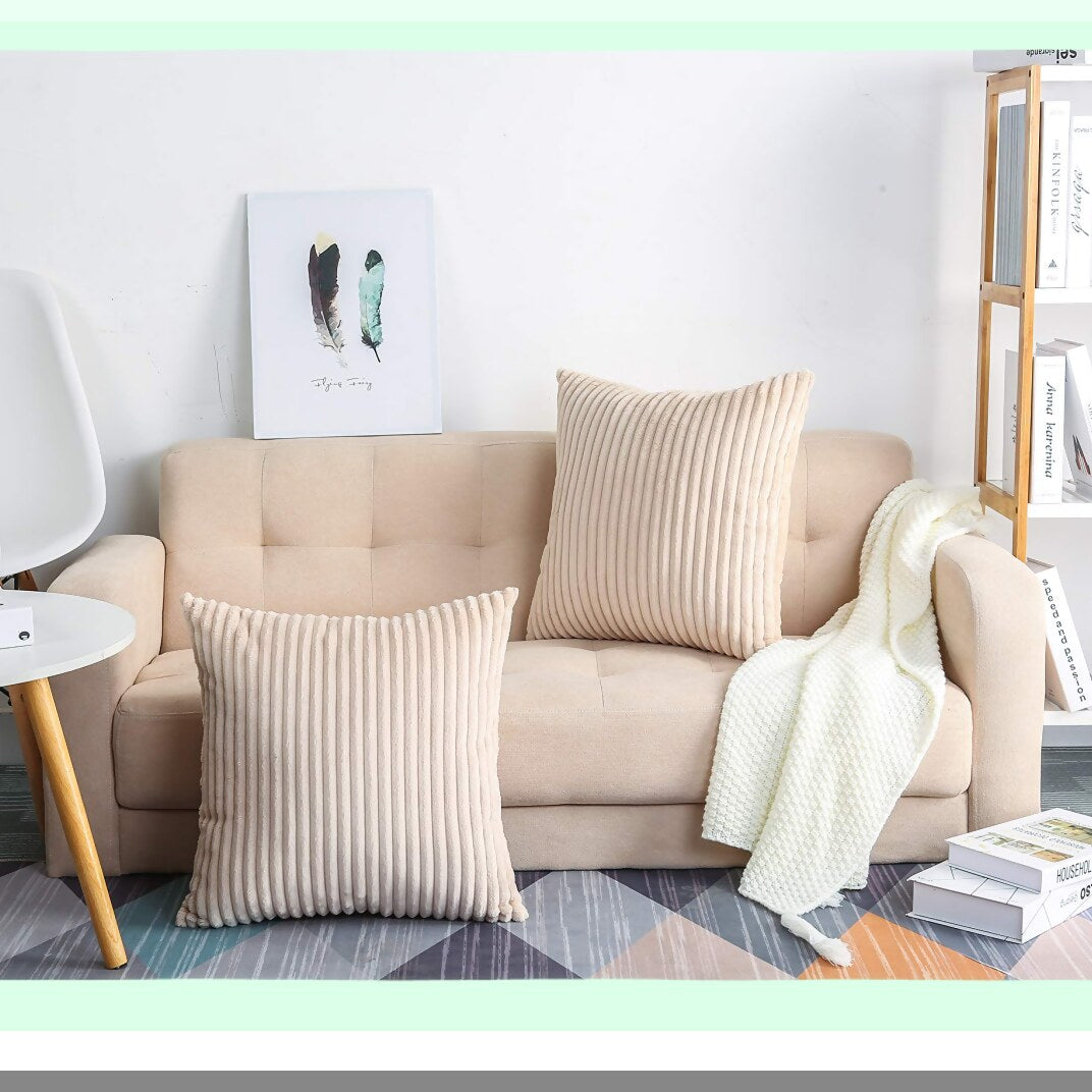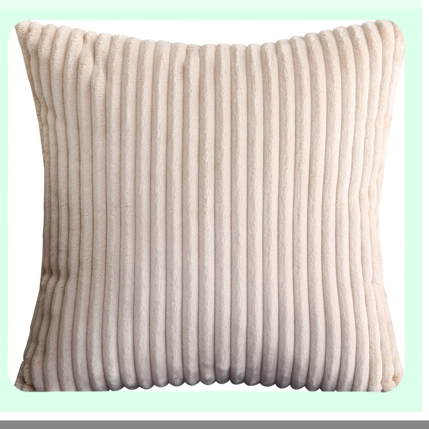 Luxury Velvet Striped Corduroy Throw Pillow Covers - Set of 2 Soft Plush Square Cushion Cases - Decorative Solid Beige 18"x18" - A17 Collection