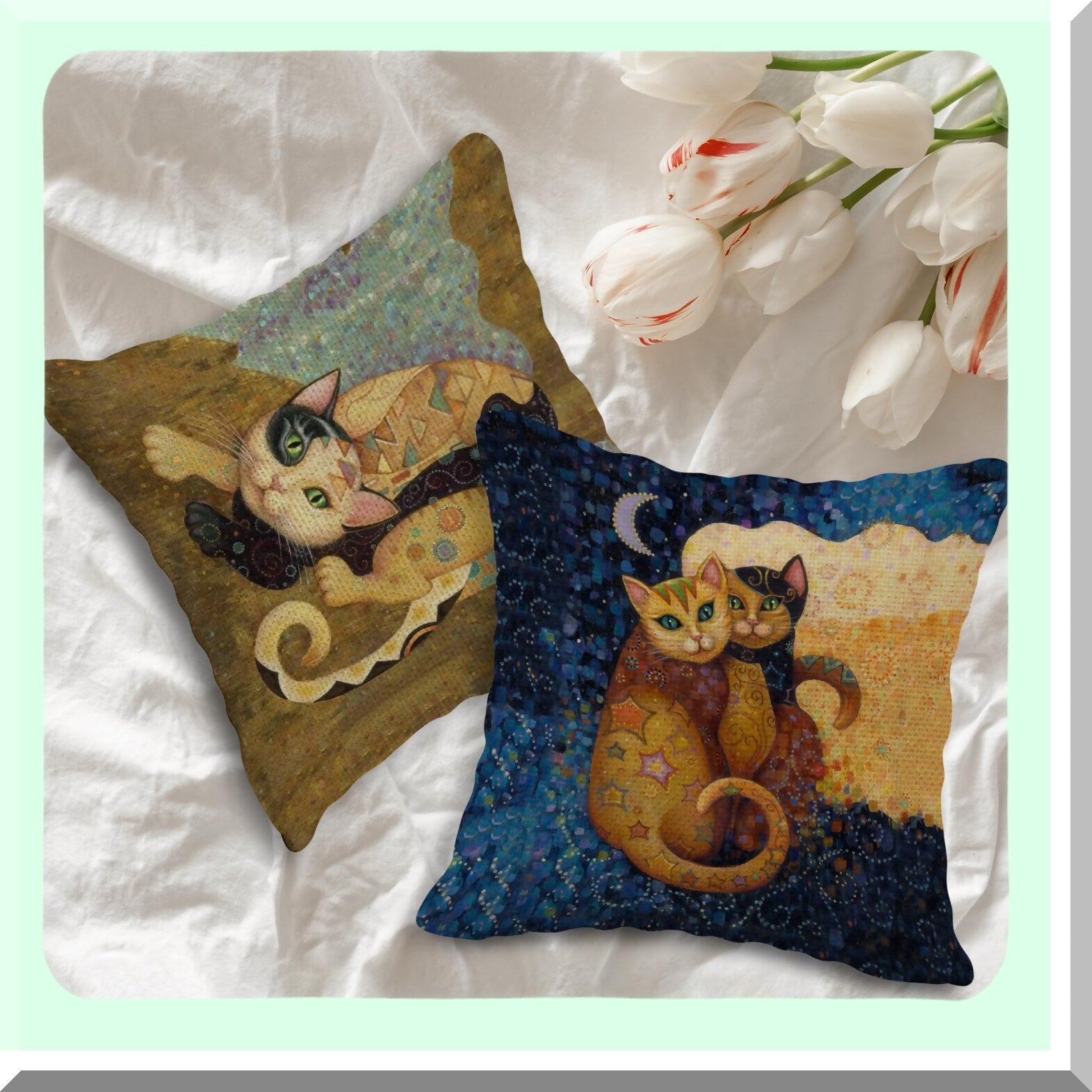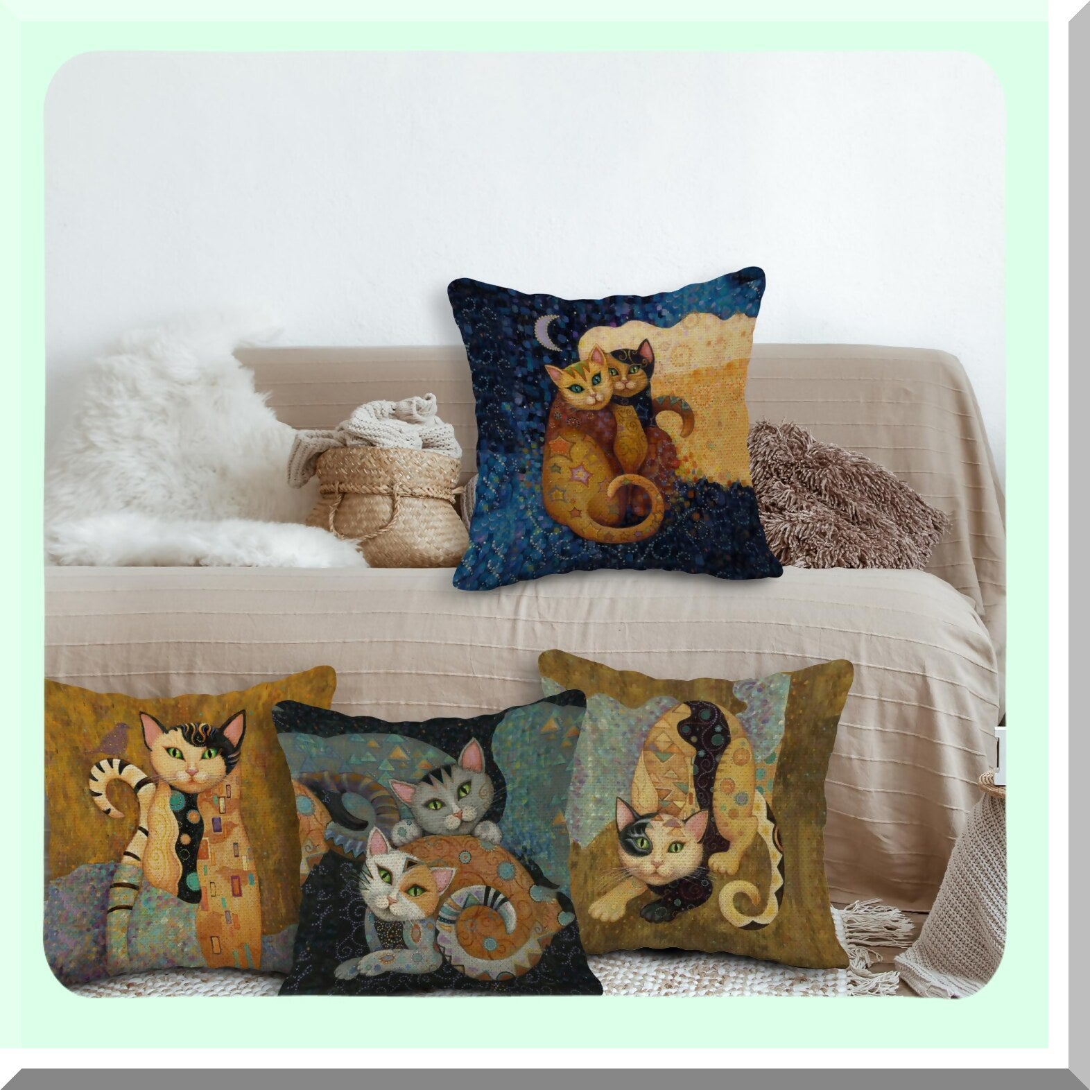 Funny Cat Theme Linen Pillowcase Set - Cat Lover Gifts - Children's Room Decor - Sofa Couch Bed Cushion Cover - Abstract Cat Design - 18x18 Inch - Pack of 4