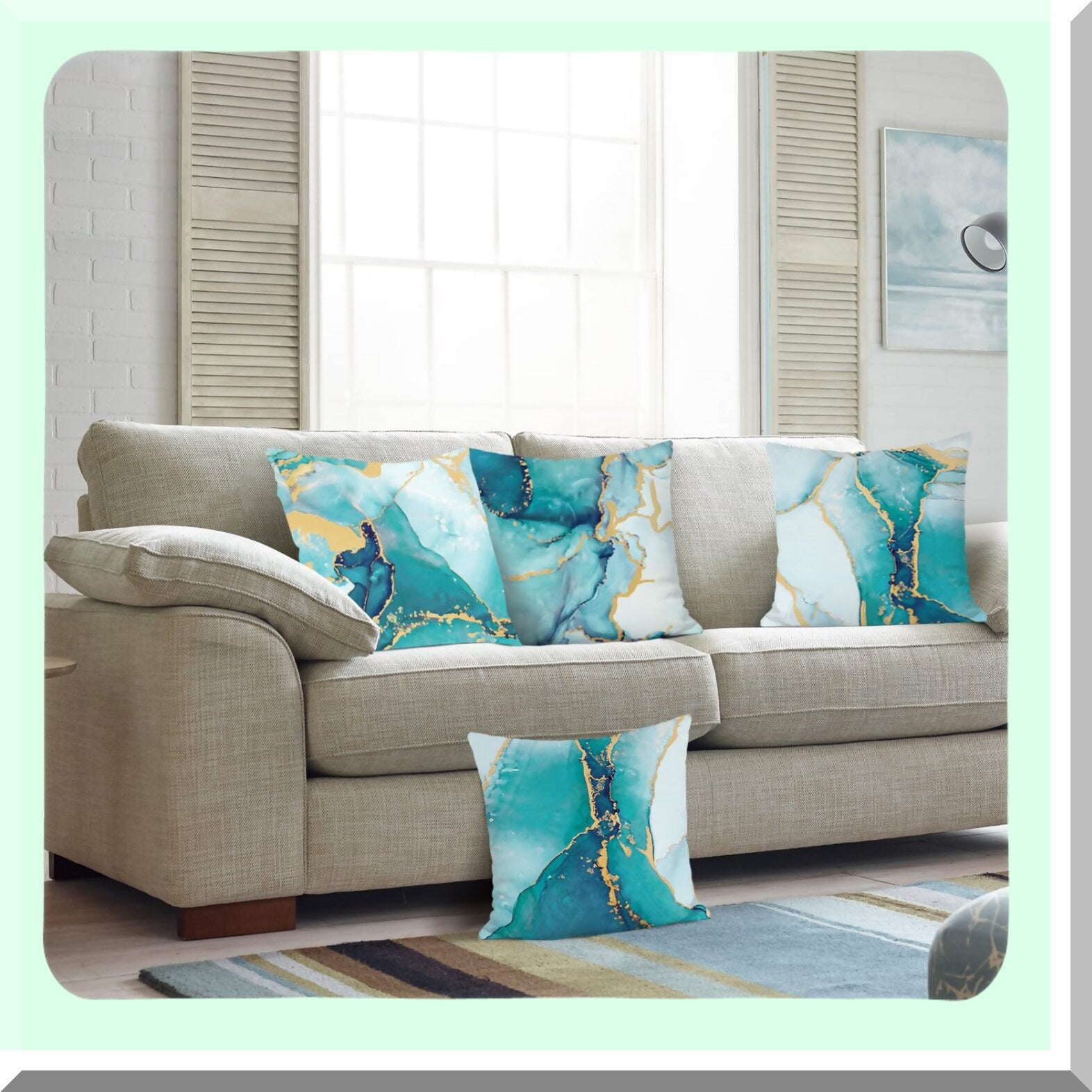 The turquoise marble pillow covers feature a unique two-sided design with a beautiful marble texture, adding a fresh pop of color to your furniture and home decor. This design element enhances the aesthetic appeal of any room and provides a quick and easy way to update the look of your living space. The covers are versatile and can be easily mixed and matched with different decor styles. The practical benefits include enhancing the overall appearance of your home, adding a touch of luxury, and providing a cost-effective way to refresh your living space.