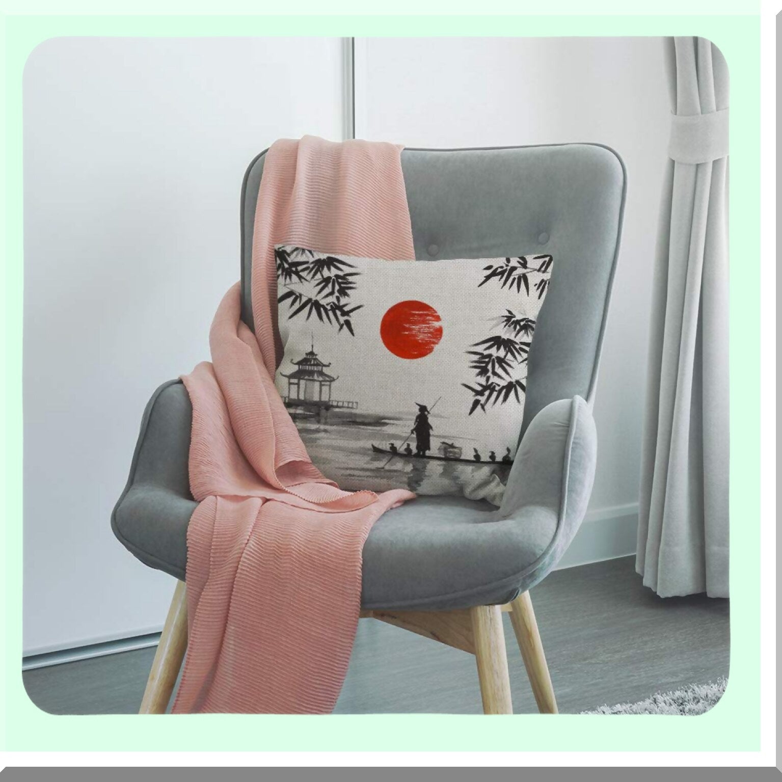 Japanese Boatman Cotton Linen Throw Pillow Cover - Home Office Decor 18" Square - Traditional Painting Cushion Case - No Insert Needed